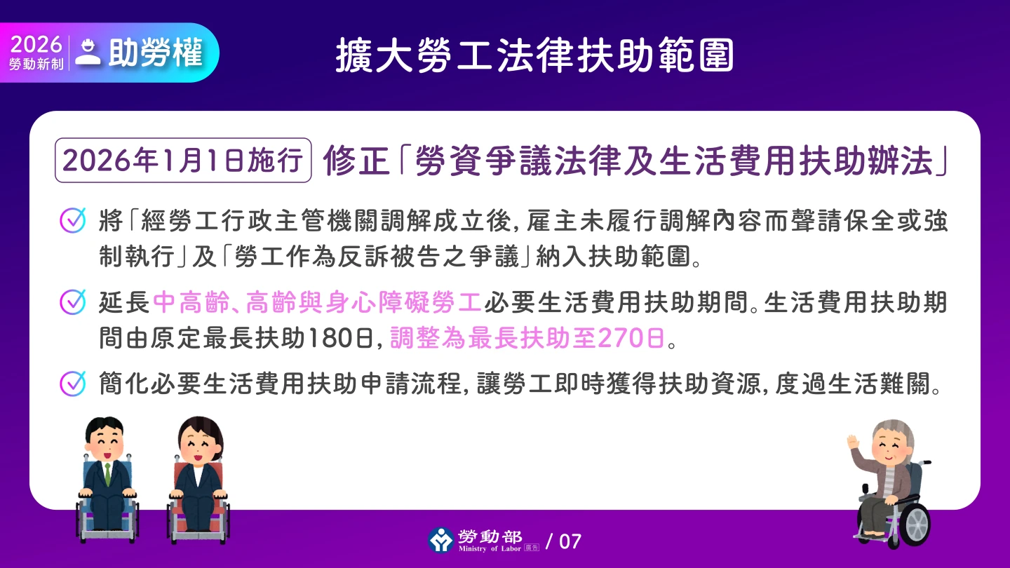 此外,勞動部勞動關係司司長王厚偉表示,明年起擴大將經勞動主管機關調解成立後,雇主卻未履行調解內容的勞資爭議,納入勞工訴訟扶助範圍,同時也簡化必要生活費用扶助申請流程