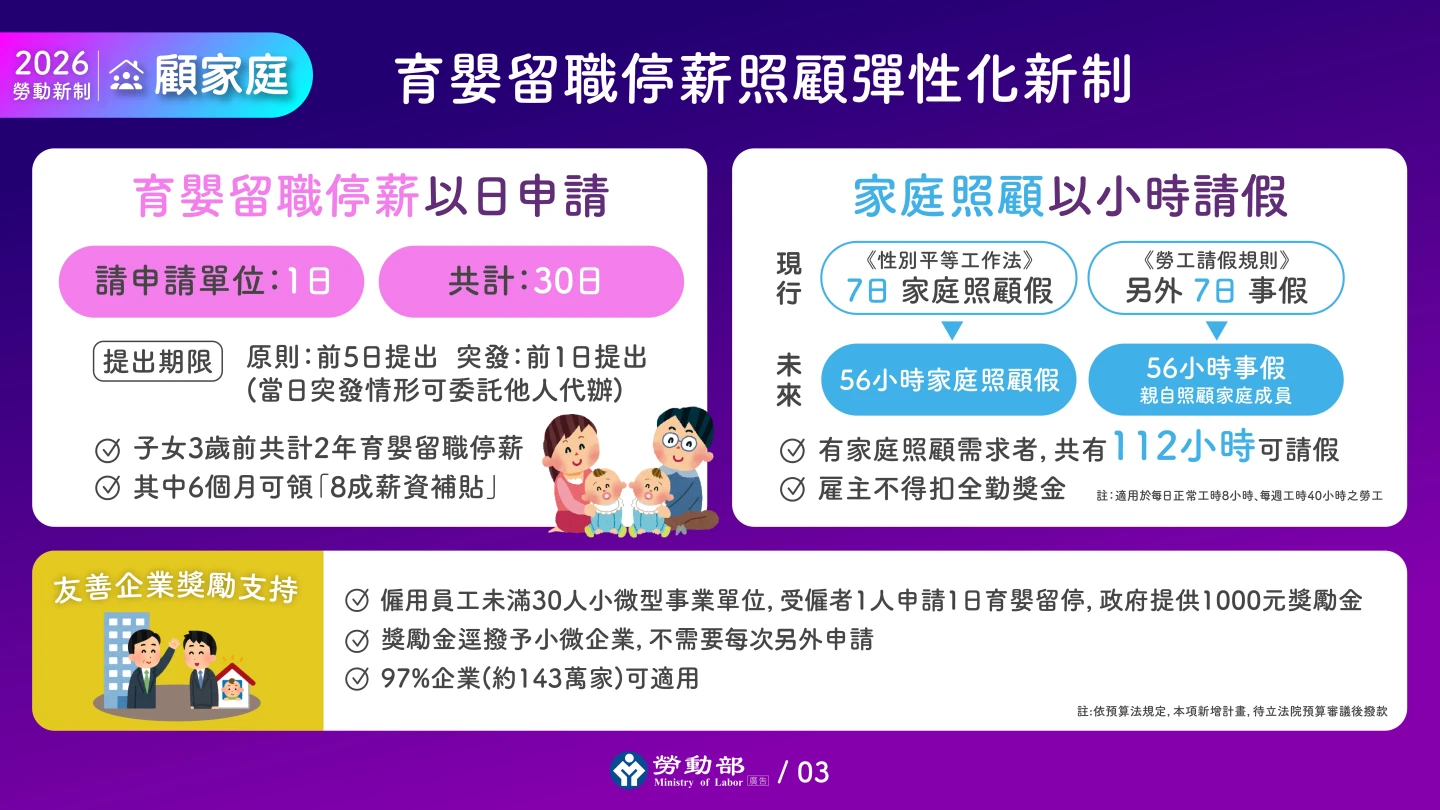 顧家庭方面,黃琦雅說,明年起,勞工可以有30日的額度,以「日」為單位申請育嬰留停,雙親合計可以請60日,而育嬰留停期間在6個月內的話,仍有8成薪資補貼。