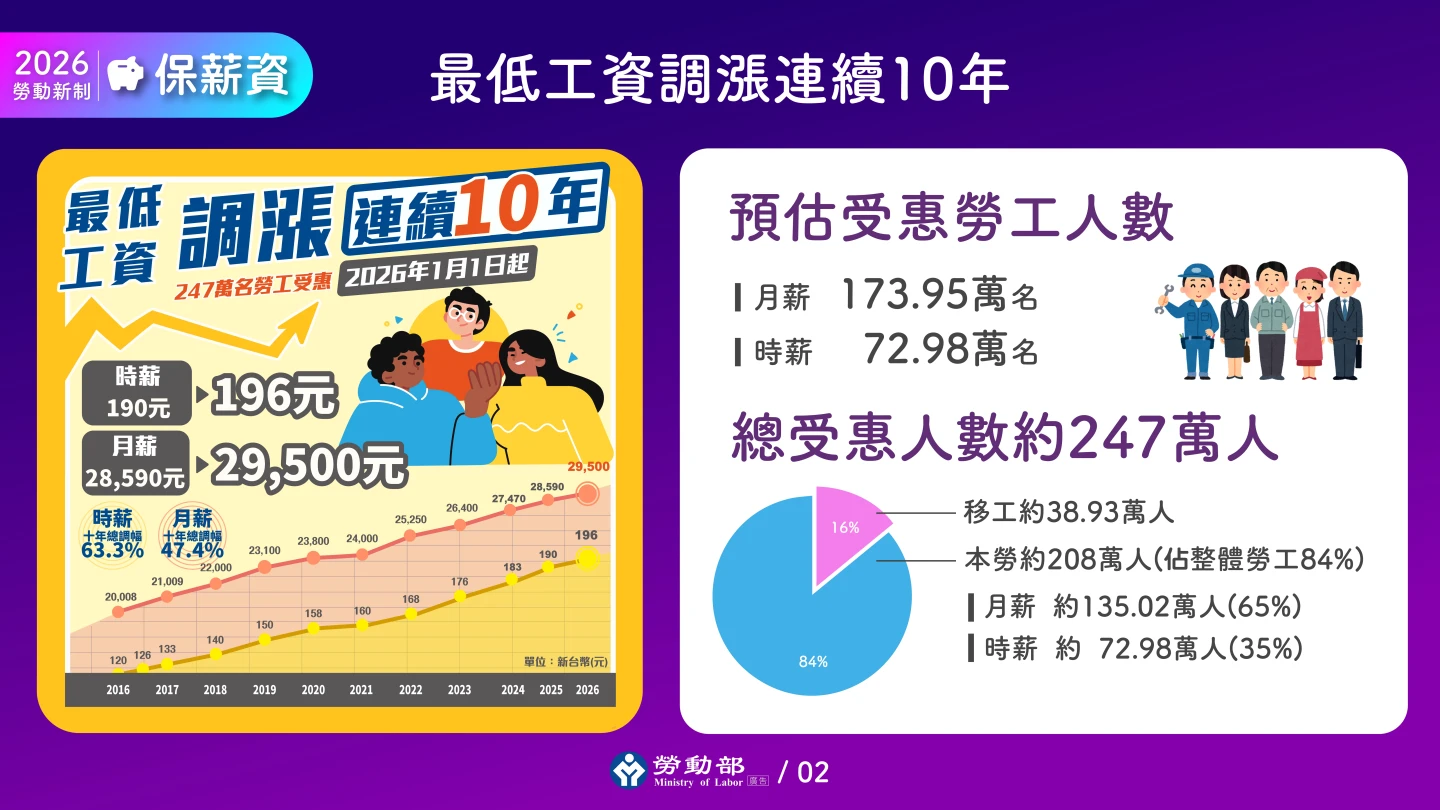 在保薪資部分,勞動部勞動條件及就業平等司司長黃琦雅表示,2026年起每月最低工資調升為29500元,每小時最低工資調升為196元,預估約247萬名勞工受惠,其中本國勞工約208萬人、84%,這是連續10年調漲。