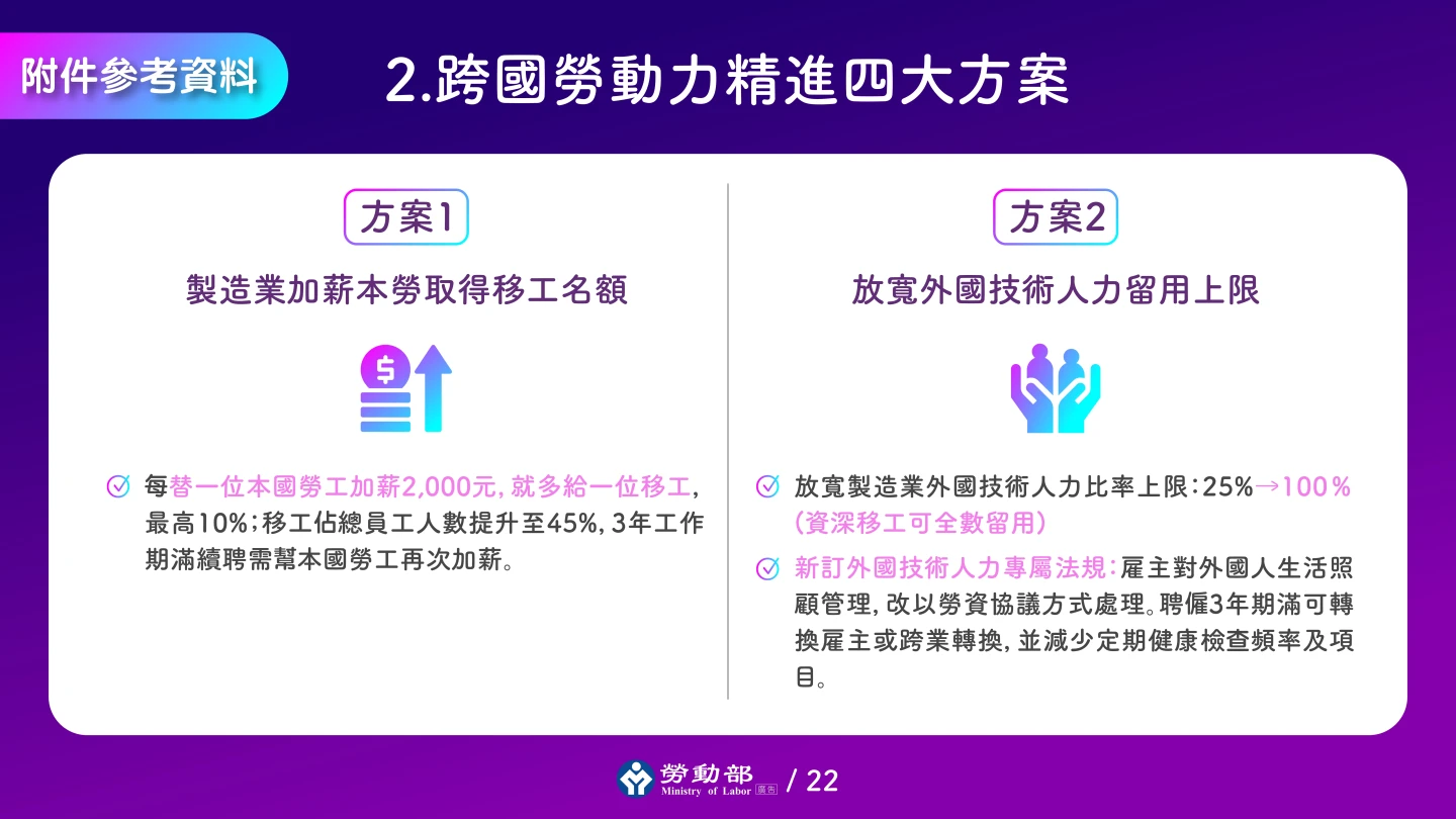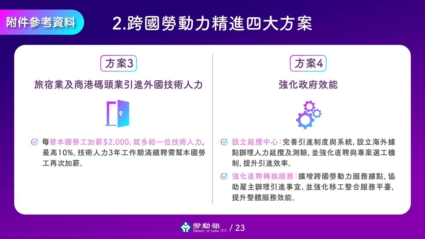 針對解缺工方面,勞動部勞發署署長黃齡玉說,明年起跨國勞動力精進四大方案上路,具體內容包含製造業增加移工名額,要加薪本國勞工,還有放寬外國技術人力留用上限,讓資深移工可全數留用,另也開放旅宿業及商港碼頭業,可透過幫本國勞工加薪的方式,引進移工人力,同時也成立首個海外延攬中心,以強化直聘、專案選工機制,並且預計擴增跨國勞動力服務據點。