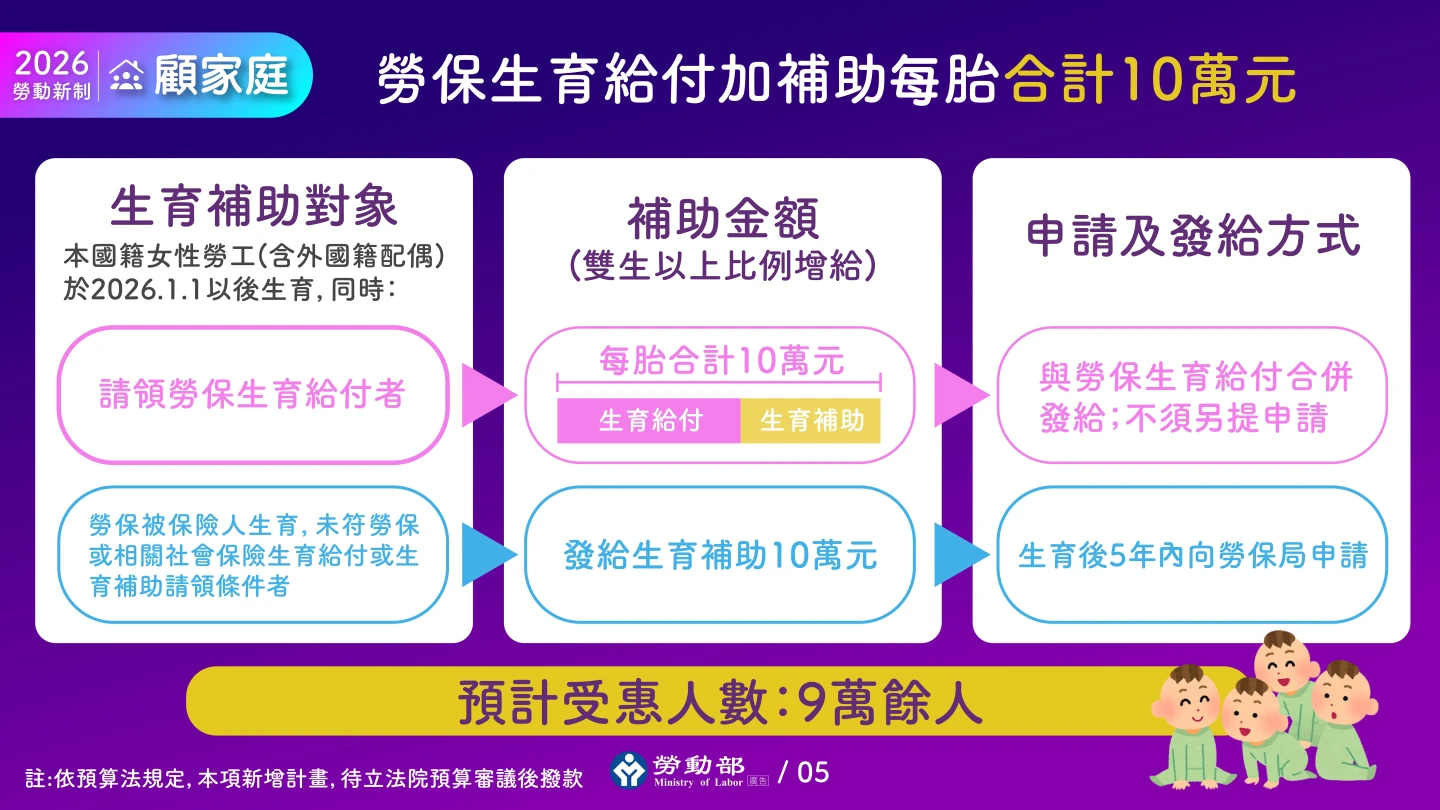 黃琦雅也提到,育嬰留停津貼及繼續加保申請手續會更彈性,可同時申請津貼及續保,並可選擇累積多日一次辦理。另外,女性勞工若在明年起生育,可請領社會保險生育給付加計生育補助,每胎均能達到10萬元,但仍要等總預算通過才能補助。