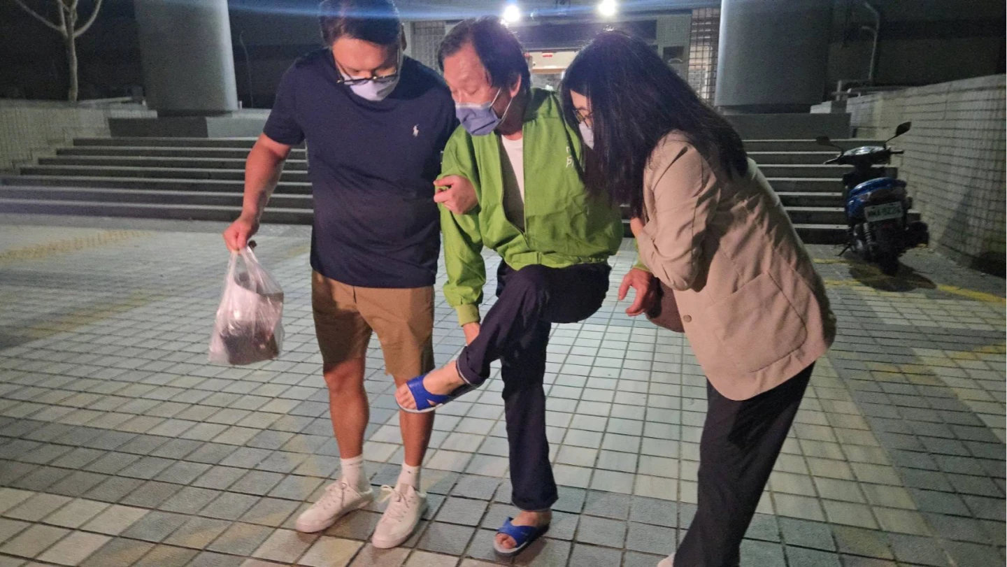 鍾嘉村今晚6時許裝好電子腳鐶,在兒子等親友陪伴下走出法院。