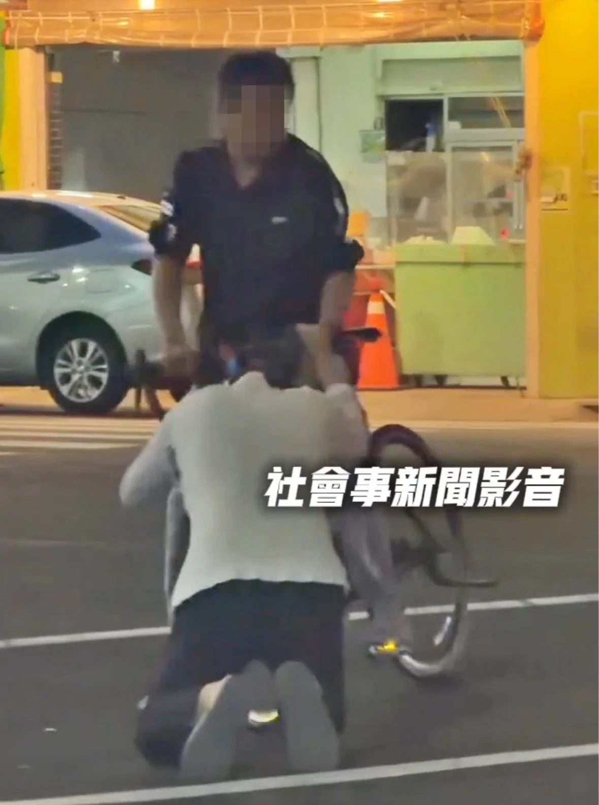 這起事件發生在昨晚6點多,地點位於台南新營區民生路與三民路口。有來車錄下過程PO網,畫面只見轎車左轉差點撞到單車,駕駛白衣男子先下車與騎士對話,接著突然跪下,拉著單車龍頭不放,似乎在求饒。騎士則說:「別啦、別啦!起來啦。」