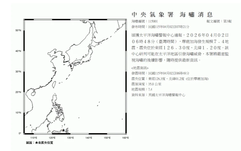 【記者王良博、陳亮諭/綜合報導】印尼東部外海今天(2日)發生規模7.4強烈地震,美國監測中心針對震央1000公里範圍內地區發布警報。