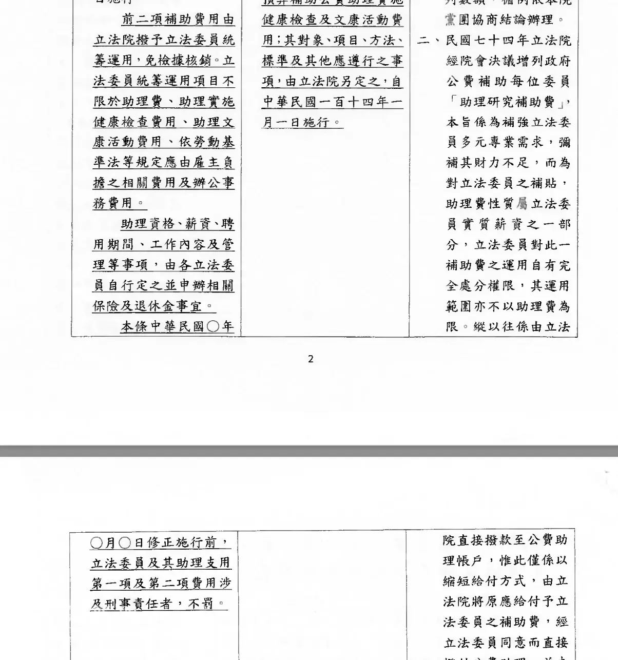 【記者蘇柏銓/台北報導】國民黨立委陳玉珍提案修法,擬將公費助理費改由立委統籌,遭批評是為助理費除罪化,為的是身陷詐領助理費官司的藍委顏寬恒。今有消息指出,該法案寫手是國民黨團總召傅崐萁許姓助理,不過據《知新聞》了解,該法案出自立法院法制局,且最初始的版本,還有「回溯條款」,言明哪天修正施行前,立委及助理支用涉刑事責任者,不罰,這才是為了救藍委顏寬恒。