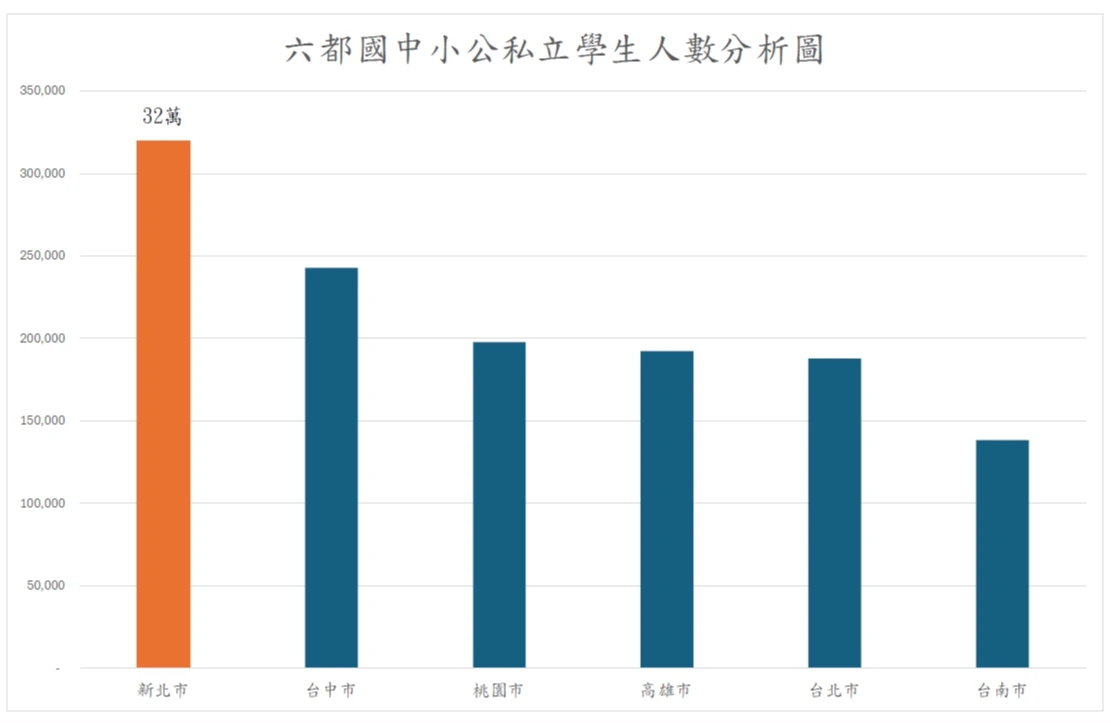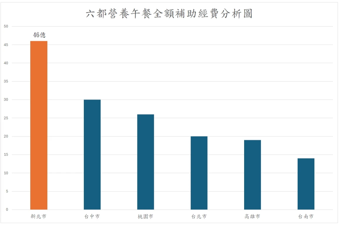 侯友宜指出,新北市對於弱勢家庭學生營養午餐免費,已經實施非常多年,每年約編列13.5億元。至於營養午餐(全面)免費,預估要編列46億元,這46億元等於吃掉一年的特教經費,也跟校舍新改建及硬體建設經費相差無幾,尤其占新北市教育局業務費四分之一。