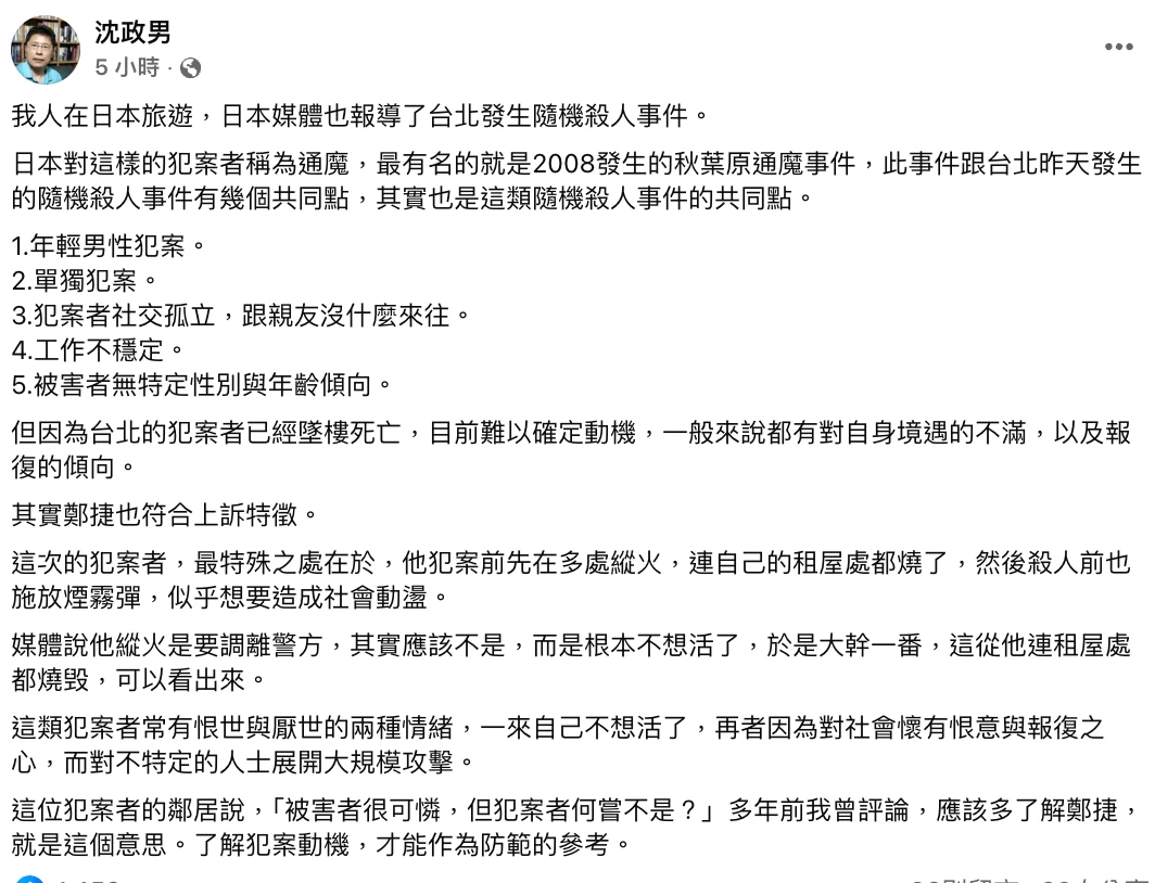 衛生福利部草屯療養院老年精神醫學組組長沈政男,昨天人在日本,他透過臉書分析重大捷運攻擊殺人犯嫌,皆有「5大共同特徵」。
