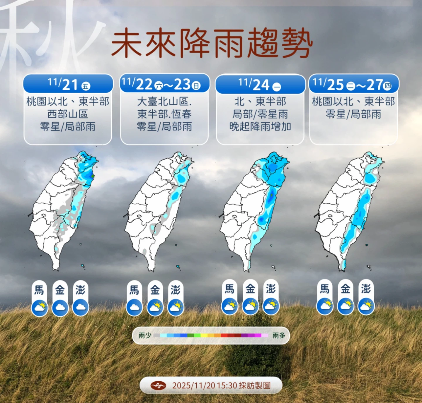 把握周末好天氣,氣象署表示,下周一(24日)新一波東北季風增強,北部及宜蘭再度轉涼,其他地區早晚溫度也偏低。桃園以北、東半部與恆春半島降雨機率增高,基隆北海岸、東北部及大台北山區雨勢較明顯且持續;其他地區多雲到晴,晚間北部將再轉為局部短暫雨。