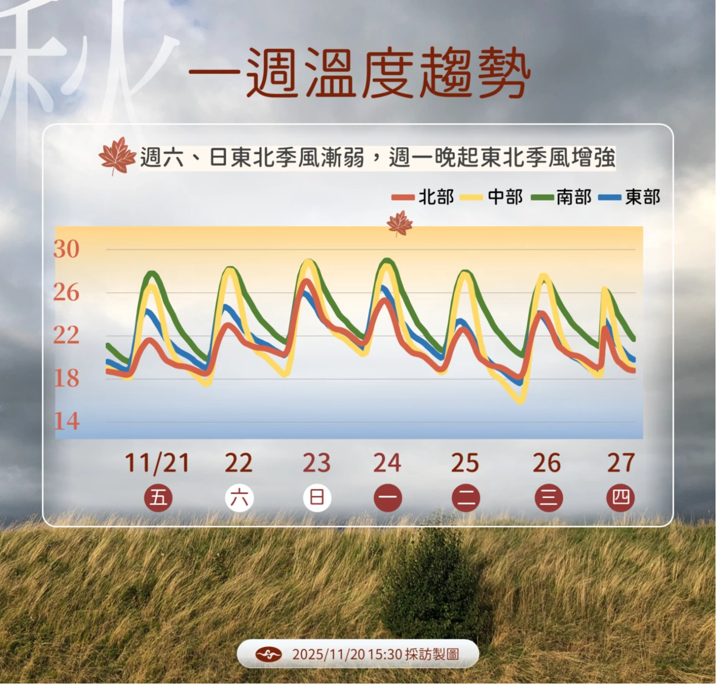 將迎來周末,氣象署說,東北季風減弱,各地白天逐漸轉暖,早晚仍偏涼。基隆北海岸、東北部及大台北山區有局部短暫雨,東部、東南部及恆春半島偶有零星降雨,其他地區多雲到晴。11/22、11/23全台及澎湖、金門、馬祖低溫約17至21°C;宜花高溫23至26°C,西半部與台東26至30°C,澎湖、金門22至24°C,馬祖18至20°C。