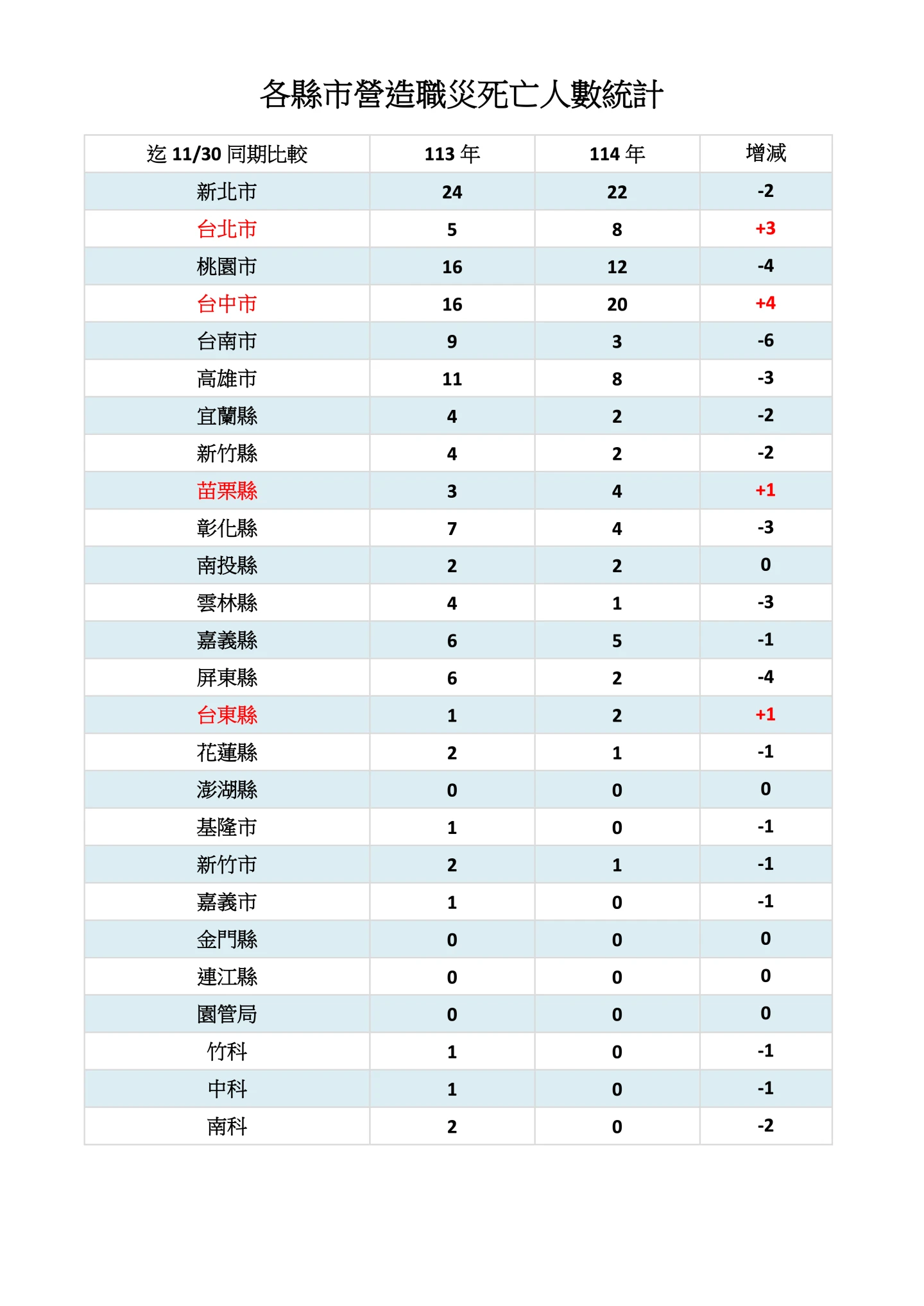 根據職安署資料,今年截至11月底,營造業職災死亡人數已達99人,人數最多的前三名縣市,分別為新北市22人、台中市20人、桃園市12人。