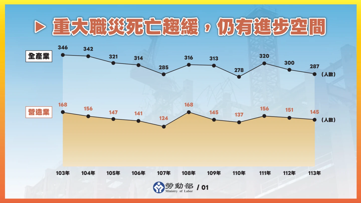 勞動部長洪申翰表示,多數重大職災案件,在職安預防階段做到位,都可以避免,我國重大職業災害死亡人數從2014年的346人,降至去年的287人,營造業也由168人下降至145人,整體職災死亡數量雖有下降,但跟OECD國家相比,我國重大職災死亡發生率仍不理想,特別是營造業,近5年每年職災奪走150條性命,代表150個家庭深陷失去家人、經濟支柱的痛苦,因此將營造業職災減災列為重點。