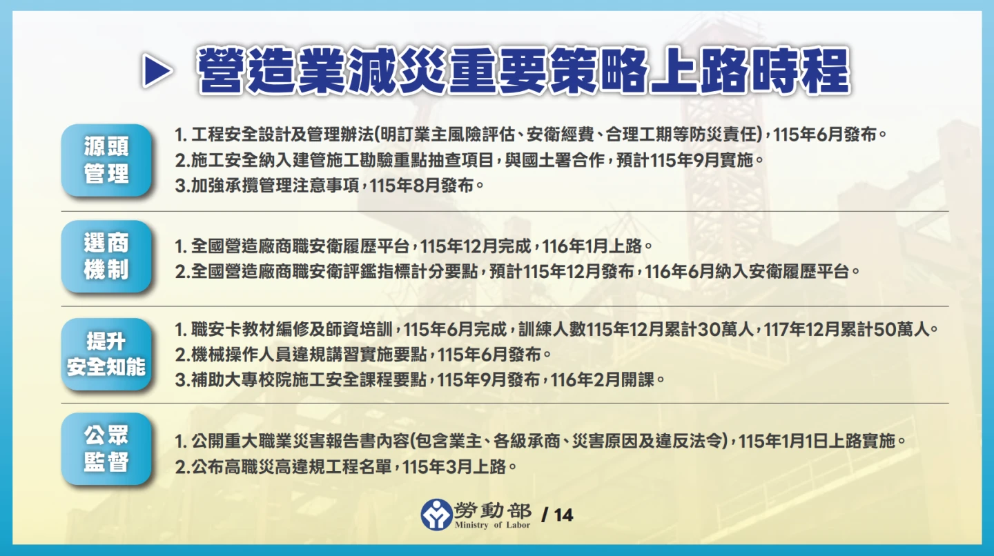 至於各項措施的上路時程,林毓堂說明,工程安全設計及管理辦法會明定業主風險評估、合理工期等,預計明年6月發布;施工安全納入建管施工勘驗重點抽查項目,預計明年9月實施;營造廠商職安衛履歷平台預計明年底完成,2027年1月上路;公開重大職災報告書內容,則將於明年1/1實施。
