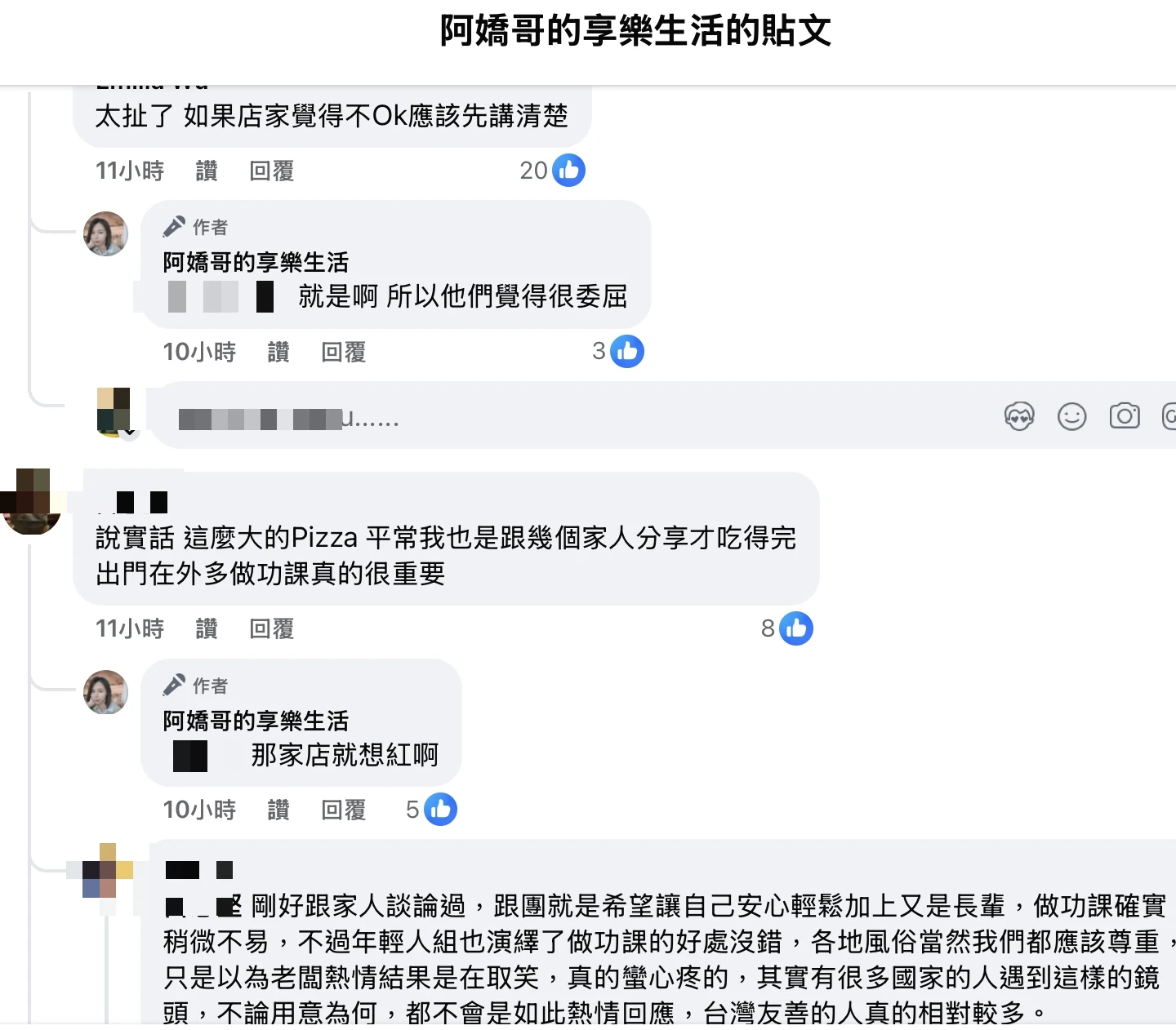 有網友留言:「太扯了,如果店家覺得不Ok應該先講清楚。」「阿嬌哥的享樂生活」則回應:「就是啊,所以他們(遭老闆公審團圓)覺得很委屈。」還有網友說:「這義大利店家真的超惡劣,人前一個樣,人後一個樣。面帶微笑,操者義大利語,百般羞辱。」
