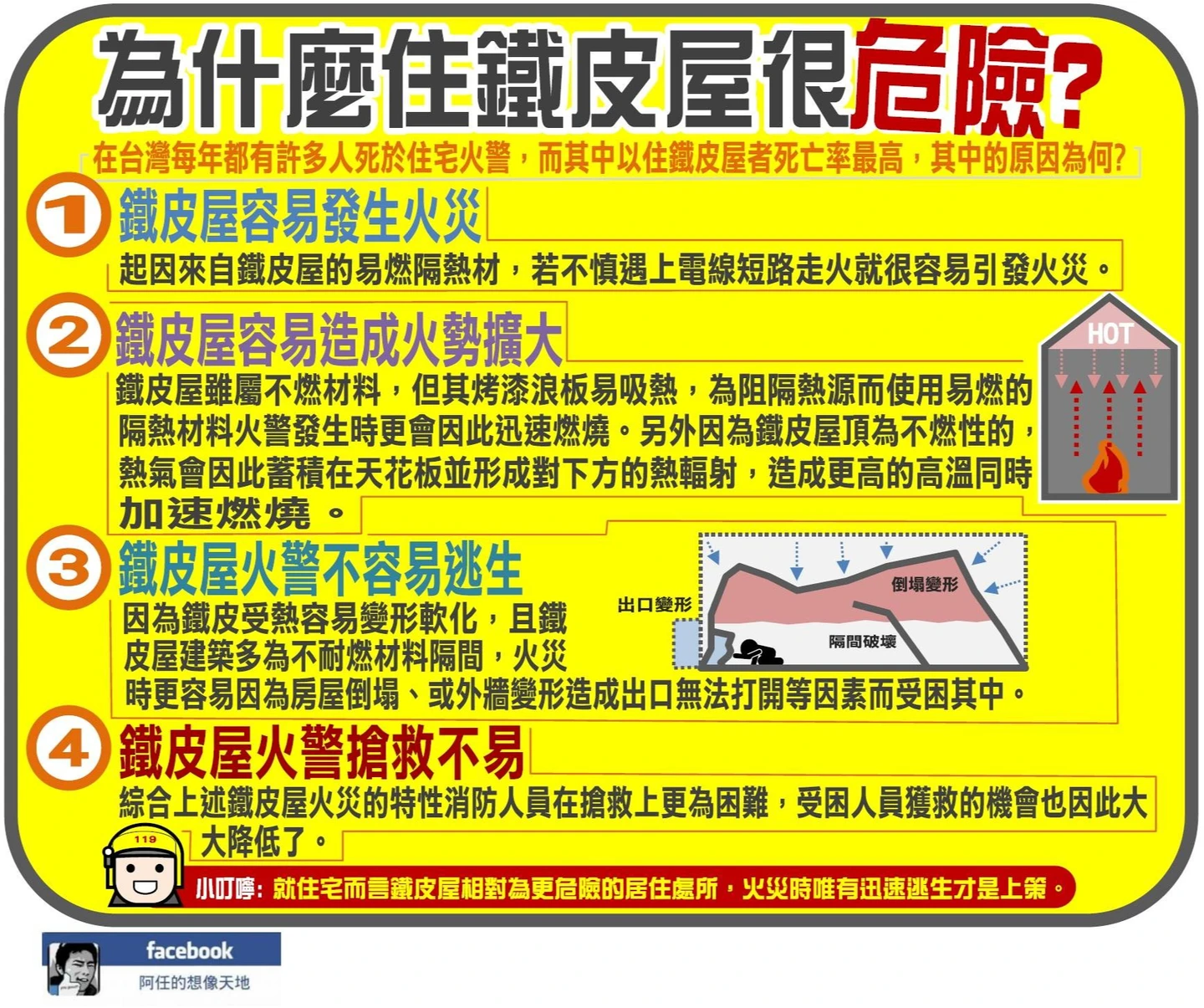 因為鐵皮受熱容易變形軟化,且鐵皮屋建築多為不耐燃材料隔間,火災時更容易因為房屋倒塌、或外牆變形造成出口無法打開等因素而受困其中。
