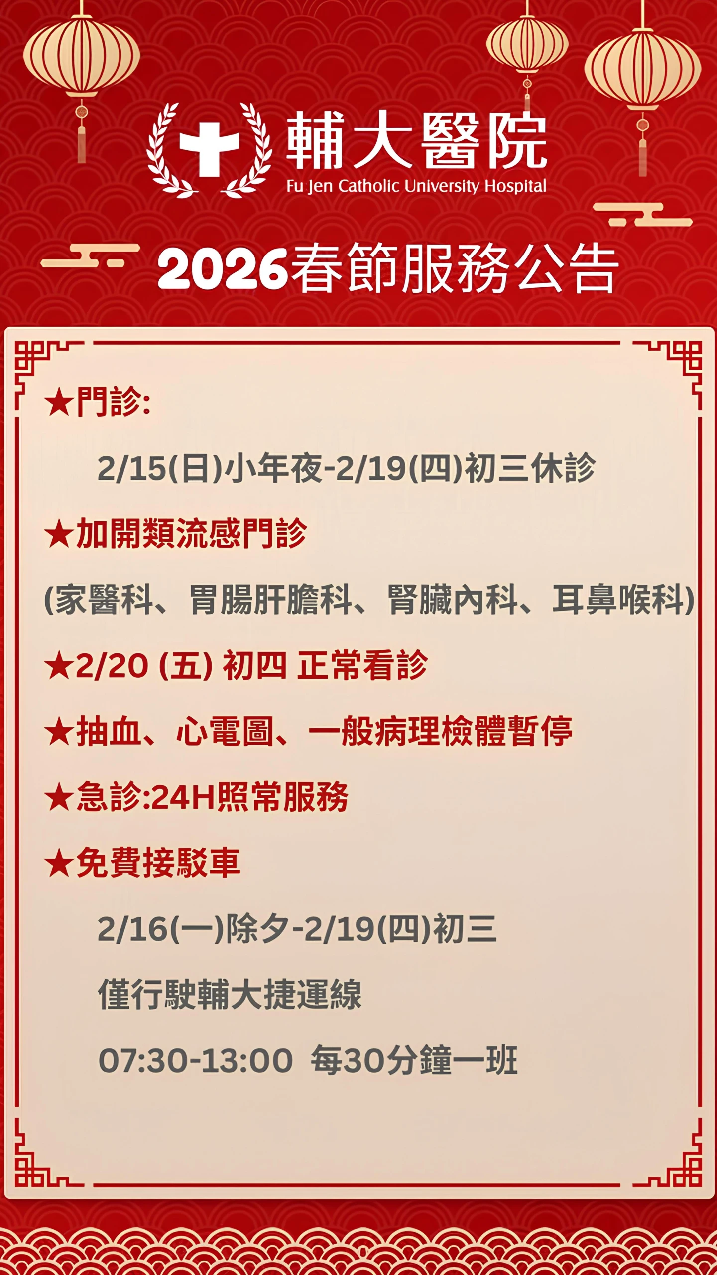 【記者曾伯愷/新北報導】為因應農曆春節連續假期期間,民眾就醫需求,輔仁大學附設醫院盤整院內醫療量能並提醒部署,從2月14日至2月22日啟動「春節門、急、住整合應變機制」,確保春節連續假期期間,民眾就醫需求。