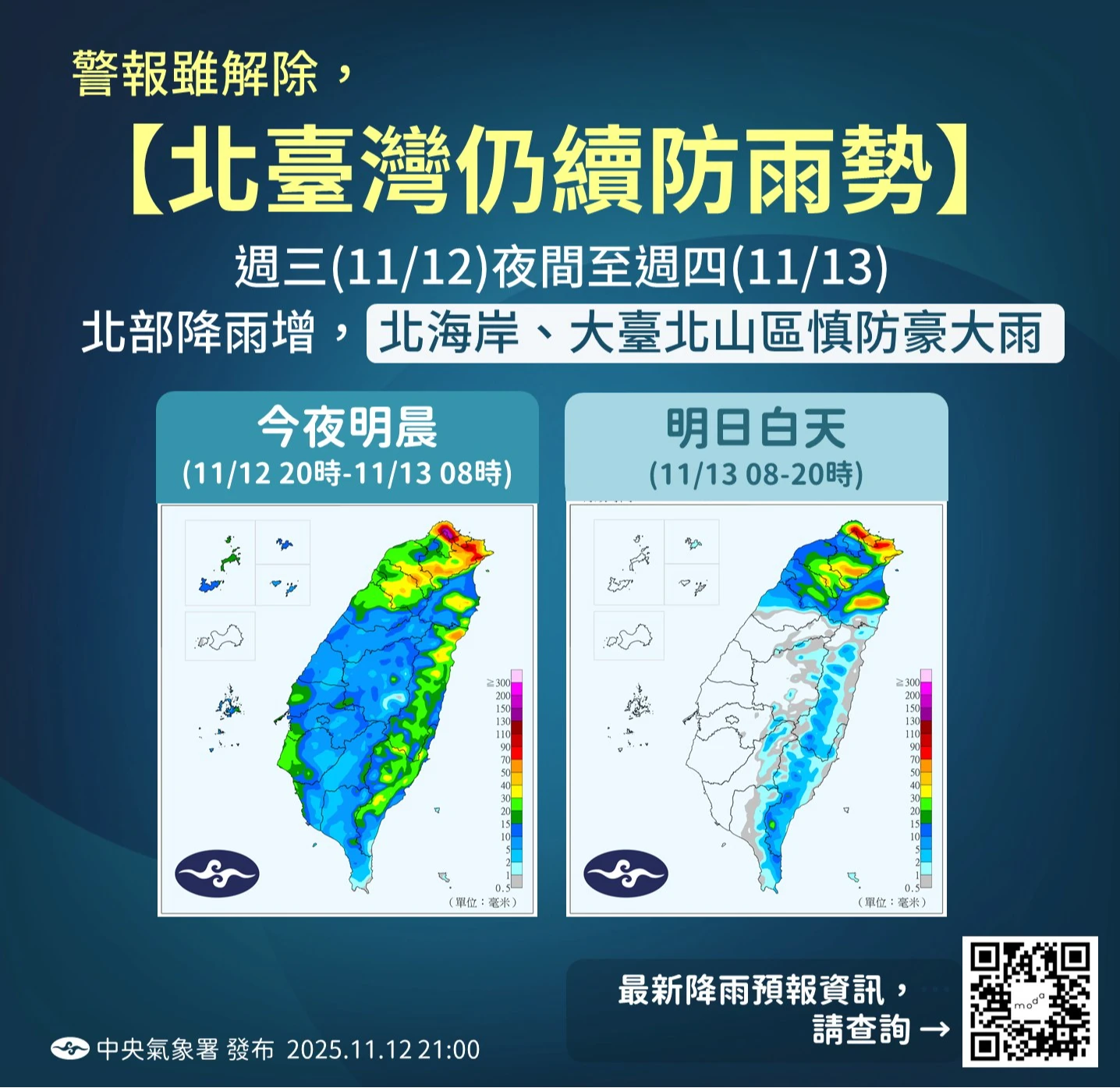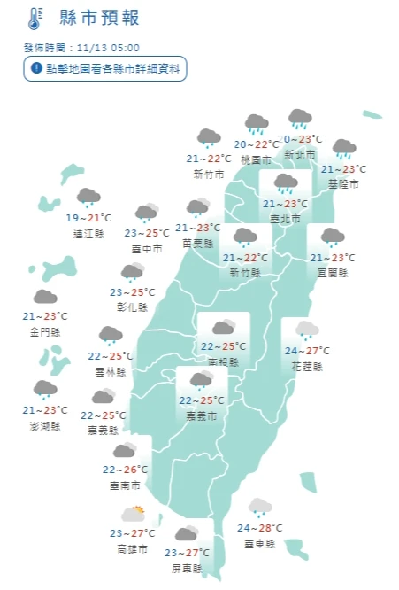 氣象署指出,今(13日)受熱帶性低氣壓殘餘水氣與東北季風增強的雙重影響,全台水氣偏多,特別是迎風面的桃園以北地區為持續有雨的天氣型態,有局部大雨發生的機率,其中,基隆北海岸、大台北山區更需嚴防局部豪雨;東半部及恆春半島亦有短暫雨,其他地區為多雲偶雨。