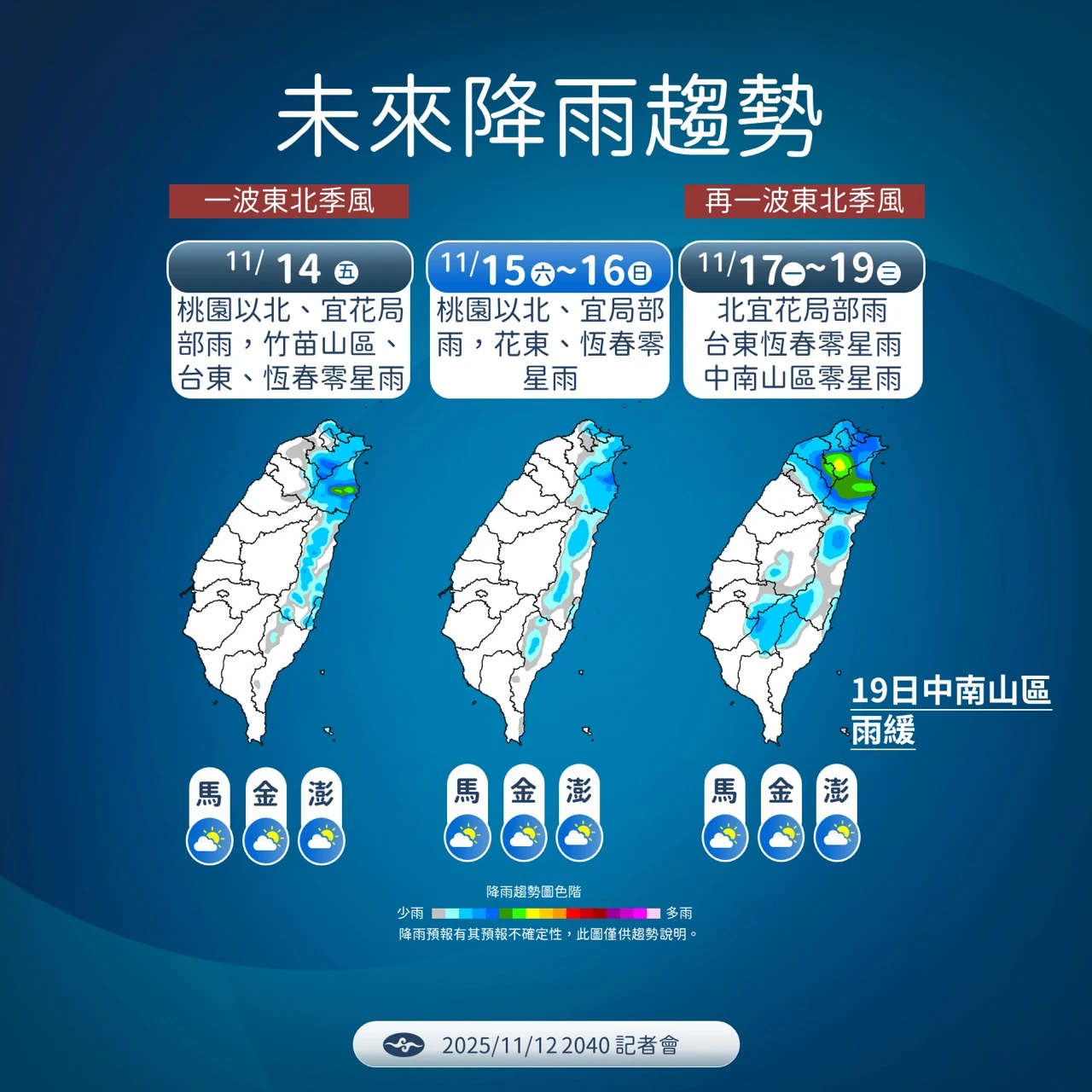 下一波東北季風,預計下周一(17日)接著南下,北部、東半部地區雨勢略增,「這波冷空氣可能會是入秋以來,降溫最為明顯的一波」,各地低溫跌到16°C至18°C或以下,局部地區最低溫有機會下探至14-15°C,「直逼大陸冷氣團等級。」