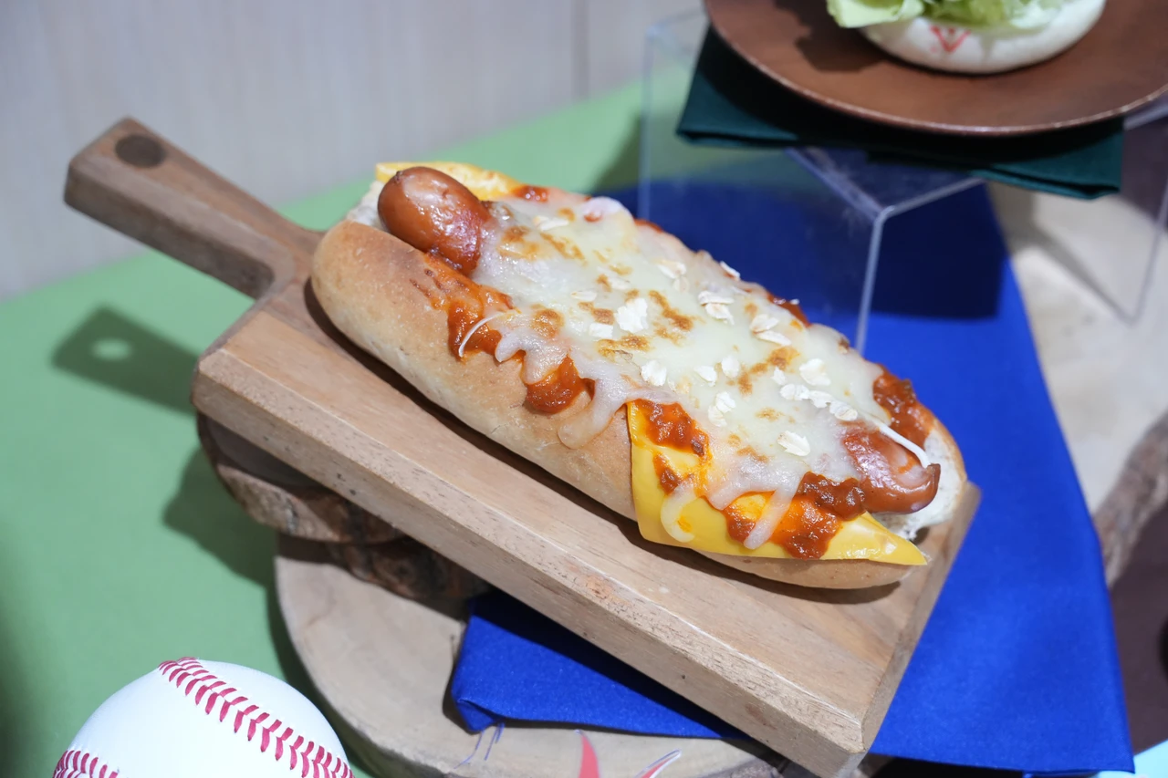 還有外型宛如球棒的「雙倍起司披薩熱狗堡120元」,嚴選台灣豬,外層為天然羊腸衣製成,並以櫸木煙燻賦予香氣,淋上蕃茄為基底及特製香料熬煮的披薩醬,鋪上切達起司片跟馬茲瑞拉起司絲。