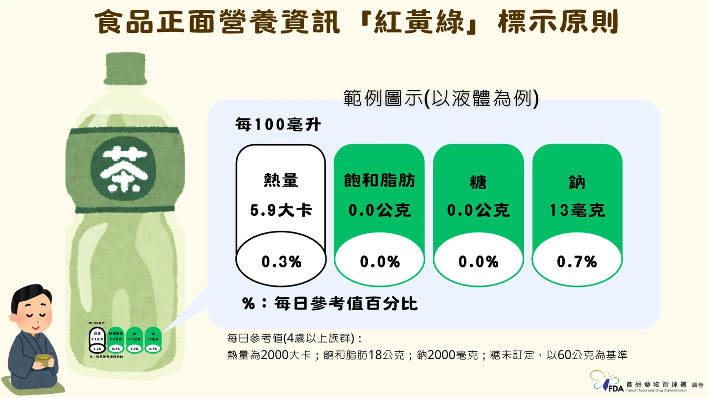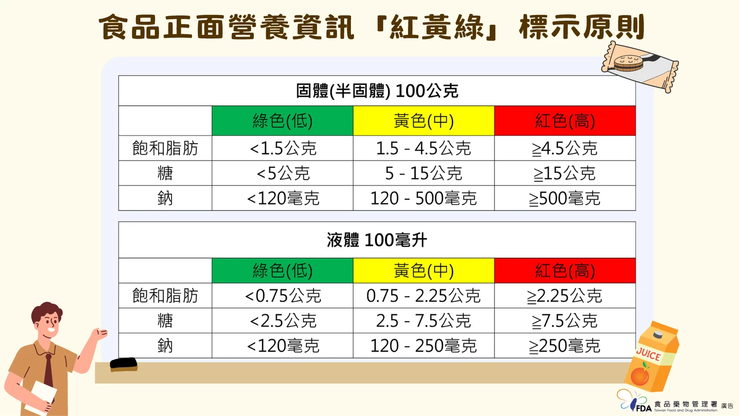 食藥署與國健署蒐集國內外實證資料及政策經驗,並參考市售包裝食品營養標示抽樣調查結果,多次召開專家會議進行研議,目前草擬之「食品正面營養資訊標示指引」將以每100公克(固體)或每100毫升(液體)為標示基準,針對糖、鈉及飽和脂肪三項營養素,採「紅黃綠」三色分級標示。