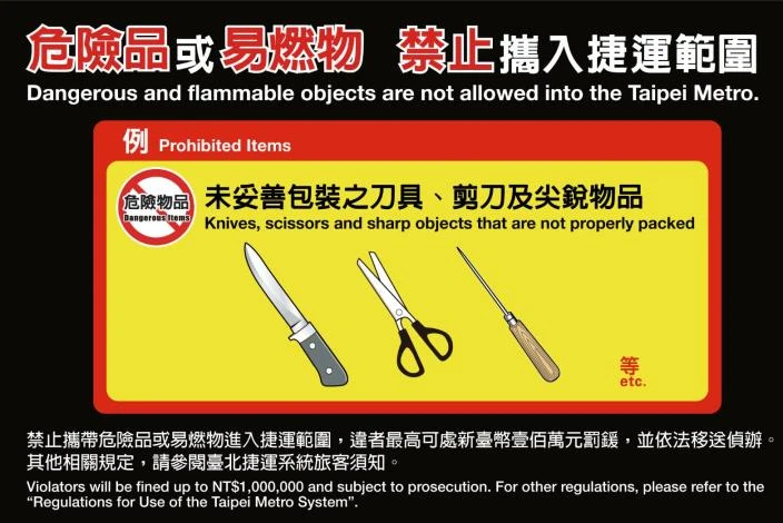 台北捷運公司指出,依造臺北捷運旅客須知第28點規定,未經許可,不得攜帶各種刀具、剪刀或其他尖銳物品等危險品或易燃物進入捷運範圍,但經妥善包裝,且無影響他人安全之虞者,不在此限,違者」規定,可依大眾捷運法第50條之1第1項第1款,裁處1萬元以上100萬以下罰鍰。