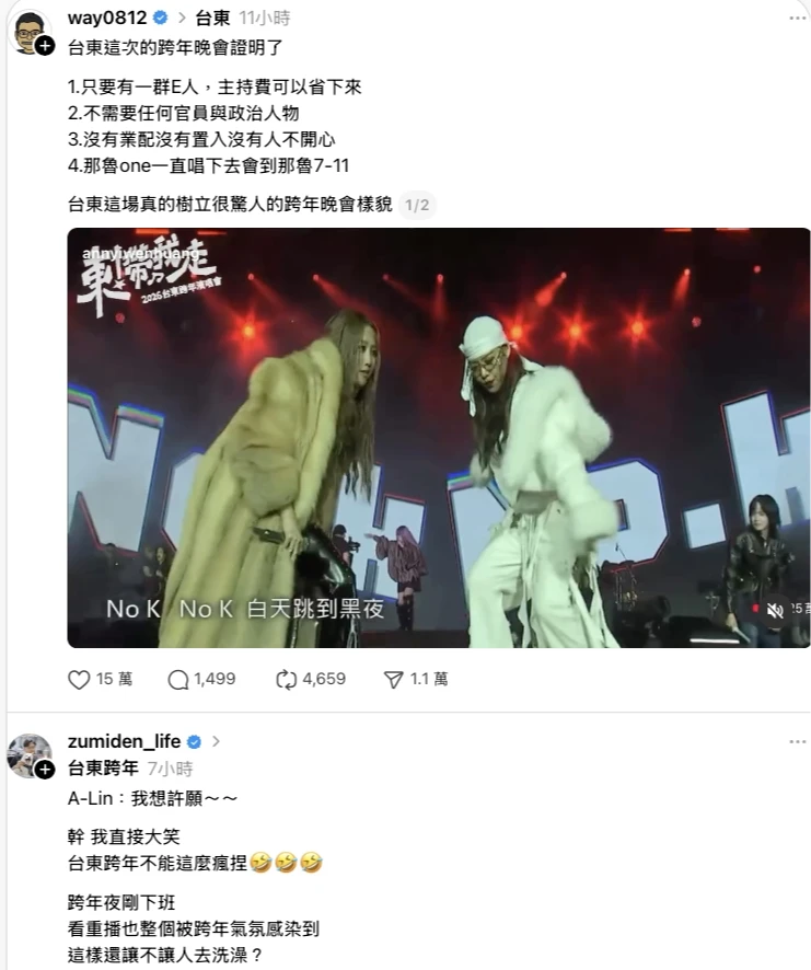 社群Threads網友W先生提出個人觀點,強調台東這次的跨年晚會證明了: