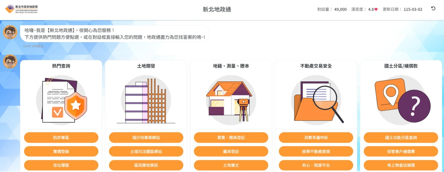 新北市地政局表示,「新北地政通」支援國、台、英語語音輸入,自2024年9月啟用,已回答5萬個問題,民眾滿意度高達4.8顆星。近來「新北地政通」精進系統升級,結合生成式AI與RAG(檢索增強生成)技術建置智慧客服系統,整合各項地政業務資訊及常見問答資料,提供全天候地政諮詢服務。