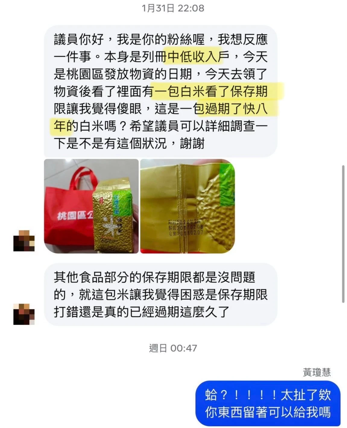 收到疑似過期白米的民眾透過社群帳號與桃園市議員黃瓊慧聯繫,稱其他食品都沒問題,但「這包米讓我覺得困惑,是保存期限打錯,還是真的已經過期這麼久了」。這也讓黃瓊慧直呼「太扯了欸!」桃園區公所得知後,也緊急找捐贈者了解狀況,同時將狀況回報桃園市衛生局。