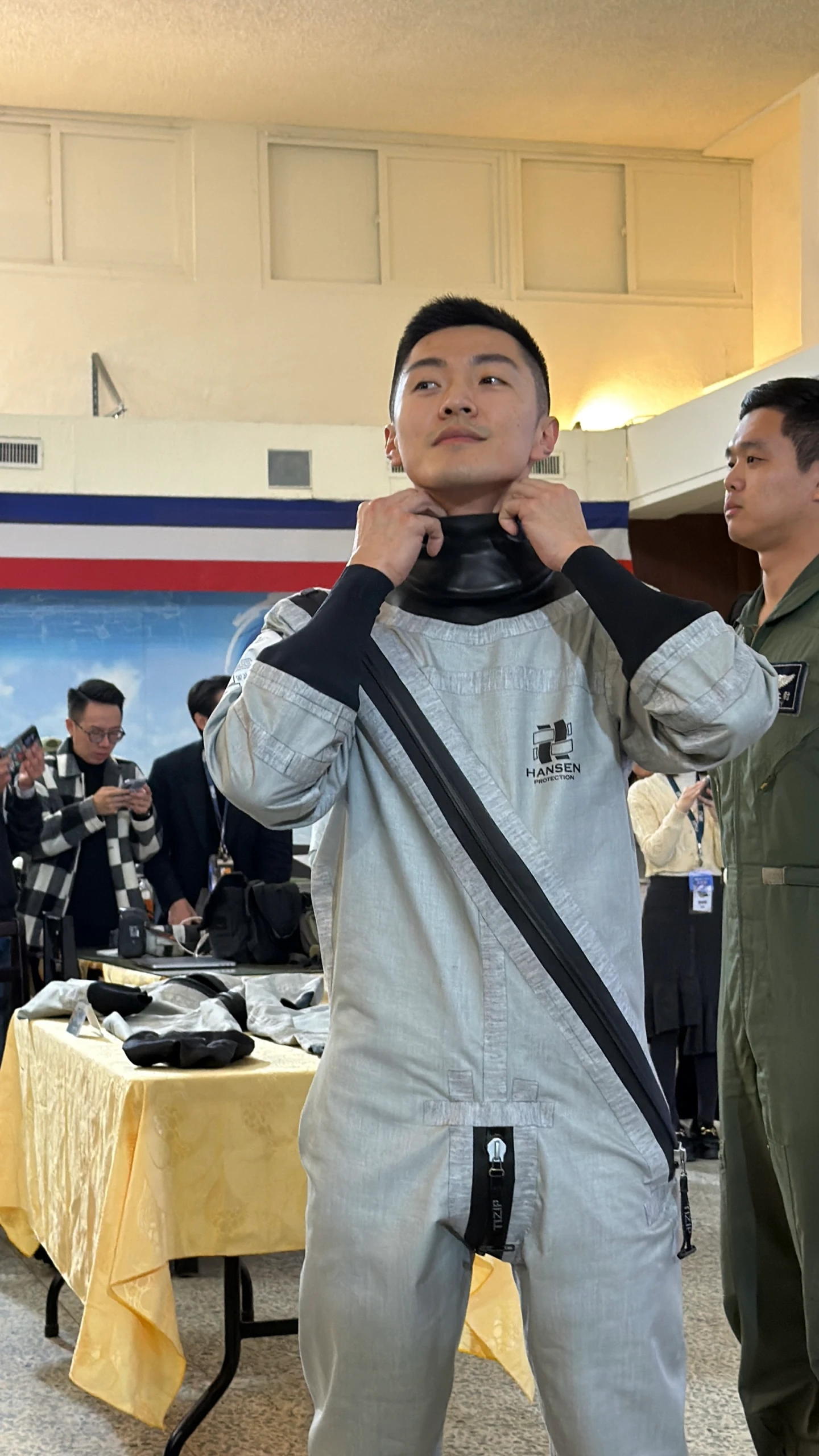 空軍第四聯隊政戰主任林家田補充,原廠共提供14種尺寸飛官穿著,目前已陸續配發,預計3月底前全數完成,每人一套,每套有效期10年,未來包括幻象2000、IDF都會穿著,空運部隊則是另一款防寒衣。
