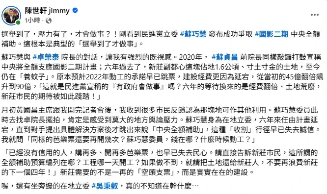 陳世軒質疑蘇巧慧,土地依然荒廢、工程停擺,「同樣的芭樂票還要再開幾次?蘇巧慧委員,錢在哪?什麼時候動工?」還酸蘇巧慧在此刻急著找卓榮泰院長「合影擺拍」,完全是選舉考量,揭露中央無能。
