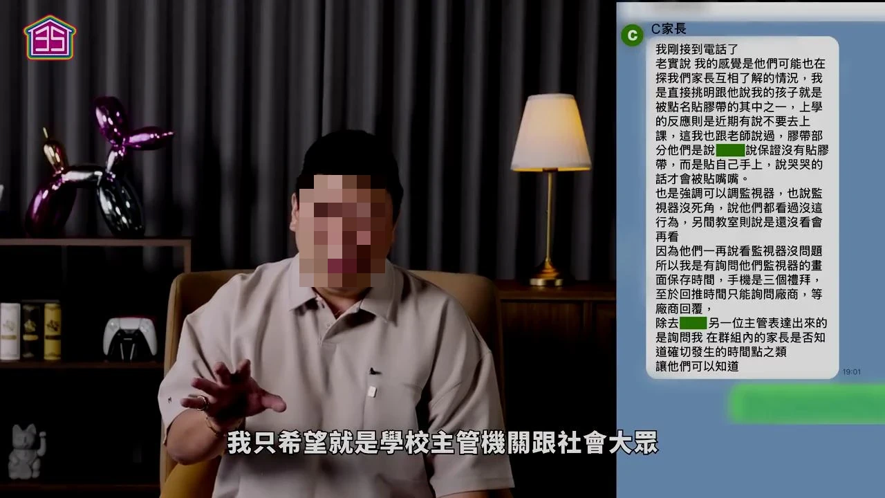 他並放出其他家長錄製的控訴,有家長說,詢問小孩後,小孩透露膠帶「貼在班上好幾位同學的嘴嘴」,且還能一一說出同學的名字;家長詢問小孩有被x老師打嗎?小孩則說,「拍好多下,會痛痛」。