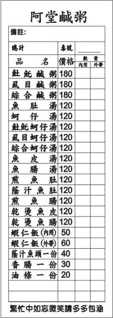 【記者王志弘/台南報導】台南知名美食「阿堂鹹粥」傳出招牌、菜單撤下店名,只剩「鹹粥」二字,引發外界猜測與其先前商標權官司敗訴有關。不過老闆張春堂指出,換新招牌是要突顯鹹粥用料豐富,與眾不同,「要換回來(舊招牌)也可以」,否認傳言。