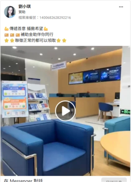 三、「領取補助金詐騙廣告」以領取生活補助金、援助津貼為關鍵字,後續以申請程序需要而要求提供金融帳戶(卡片)。
