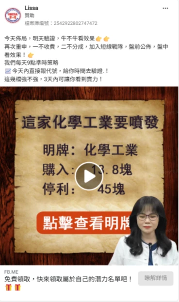 | 假投資詐騙廣告 | 準時報牌、名人公益贈書、今天佈局、明天驗證 |
