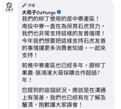 大苑子表示,今年想要把這樣支持石虎友善的事情讓更多消費者知道,一起來支持,前進中寮產區也已經多年,跟柳丁果農張大哥採購合作超過7年,「您提到的這個狀況,應該是在溝通上有落差,我們也已經有在了解及釐清,抱歉讓大家誤會!」