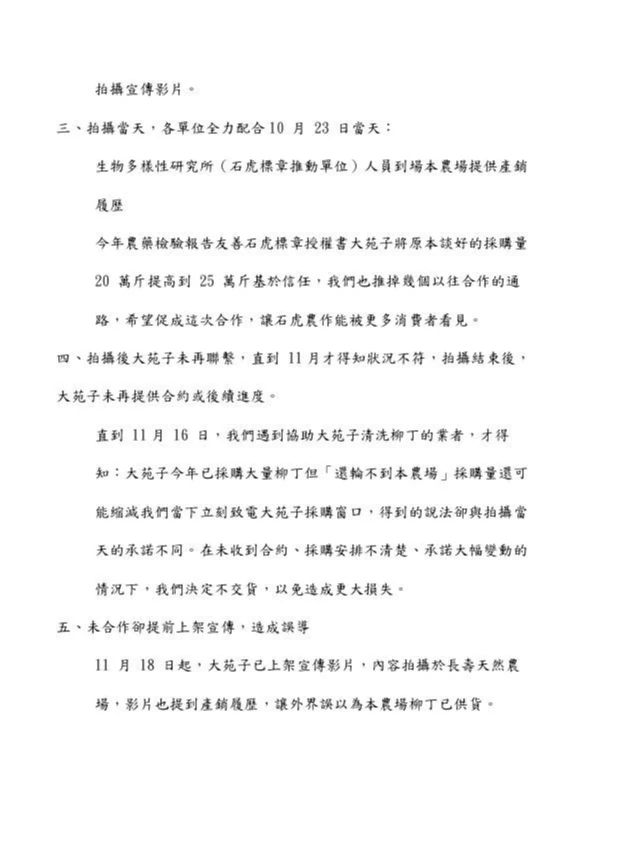 農場表示,直到11月16日,遇到協助大苑子清洗柳丁的業者才得知,大苑子今年已採購大量柳丁,還可能減少自家農場採購量,「我們當下立刻致電大苑子採購窗口,得到的說法卻與拍攝當天的承諾不同。在未收到合約、採購安排不清楚、承諾大幅變動的情況下,我們決定不交貨,以避免造成更大損失。」