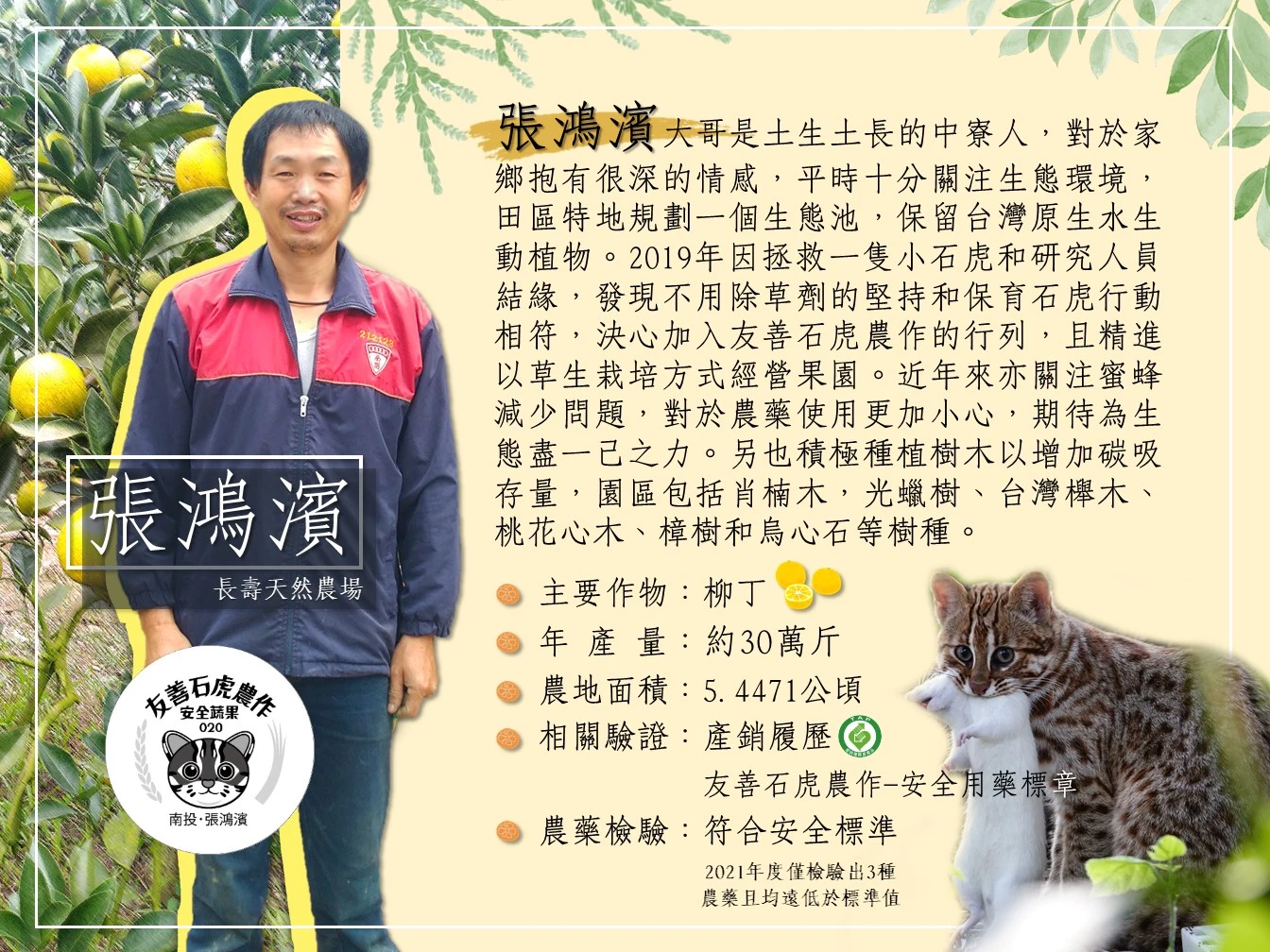 長壽天然農場位在南投縣中寮鄉,原本就很重視生態環境,2019年因為拯救一隻小石虎和研究人員結緣,加入友善石虎農作行列。