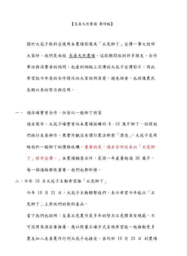 長春天然農場表示,過往確實和大苑子曾合作,但皆以一般柳丁供貨。「過去幾年,大苑子確實曾向本農場採購約 8-10 萬斤柳丁,但因為我們採行友善耕作、果實外觀沒有慣行農法那樣『漂亮』,大苑子是用略低於一般柳丁的價格收購。重要的是,過去合作從未以『石虎柳丁』對外宣傳。」而農場願意合作,是因為一年產量超過 30 萬斤,每一個通路都很重要也都珍惜。
