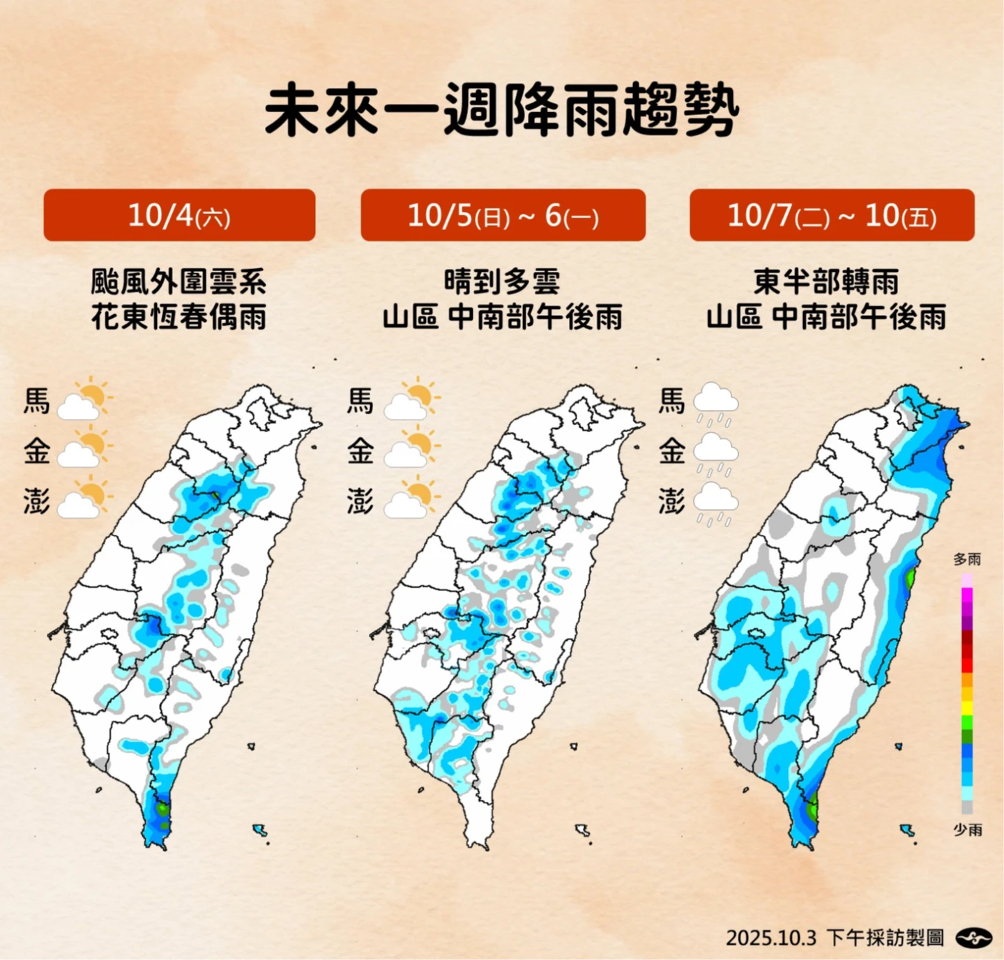 在降雨方面,吳德榮指出,今天午後局部山區偶有短暫降雨機率,而輕颱麥德姆進入南海後,南方水氣增多,恆春半島及花東偶有局部降雨。