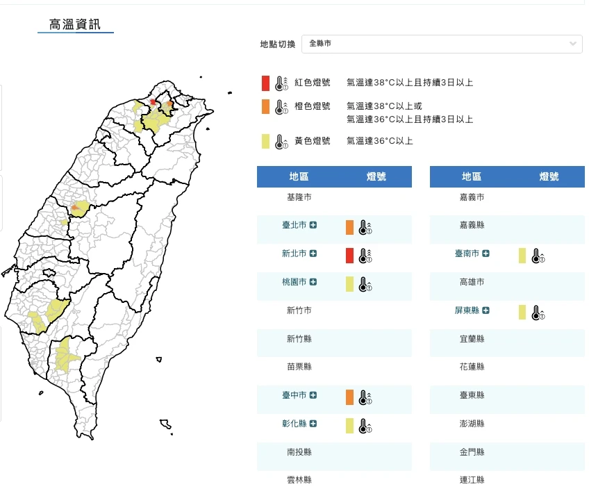 中央氣象署已發布高溫資訊,其中今天白天新北市為紅色燈號,有連續出現38度極端高溫的機率;台北市為橙色燈號,有38度極端高溫出現的機率;台中市為橙色燈號,有連續出現36度高溫的機率;桃園市、彰化縣、台南市、屏東縣則為黃色燈號,需注意36度以上高溫。