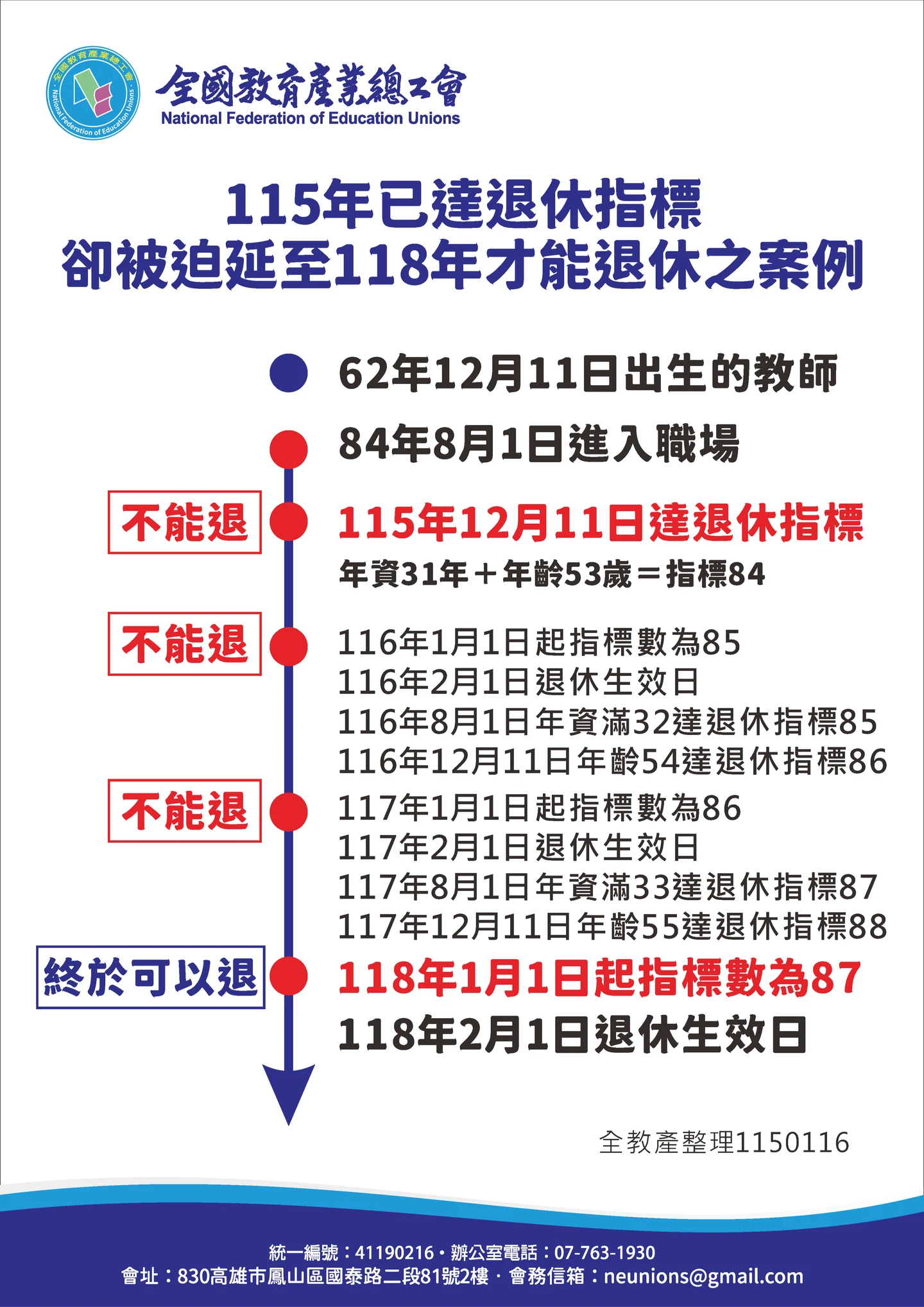 全教產舉例,假設一位教師出生於1973年12/11,自1995年8/1起任職,預計在2026年達到「年資31年+年齡53歲=指標84」的退休條件,然而,該教師真正符合指標之日落在2026年12/11,但因退休生效日僅限2/1或8/1,無法在達標日退休,只能被迫往後延,且因2027年起退休制度適用門檻調整,該教師雖在2026年已達成退休指標條件,卻因生效日限制,被迫跨入較嚴格的新制門檻,結果退休日期一路要延後至2029年2/1。