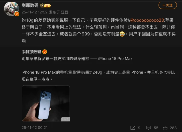 據微博帳號「剎那數碼」指出,蘋果並不打算讓下一代iPhone 18 Pro Max比前一代iPhone 17 Pro Max輕。相反地,它可能會朝相反方向調整。