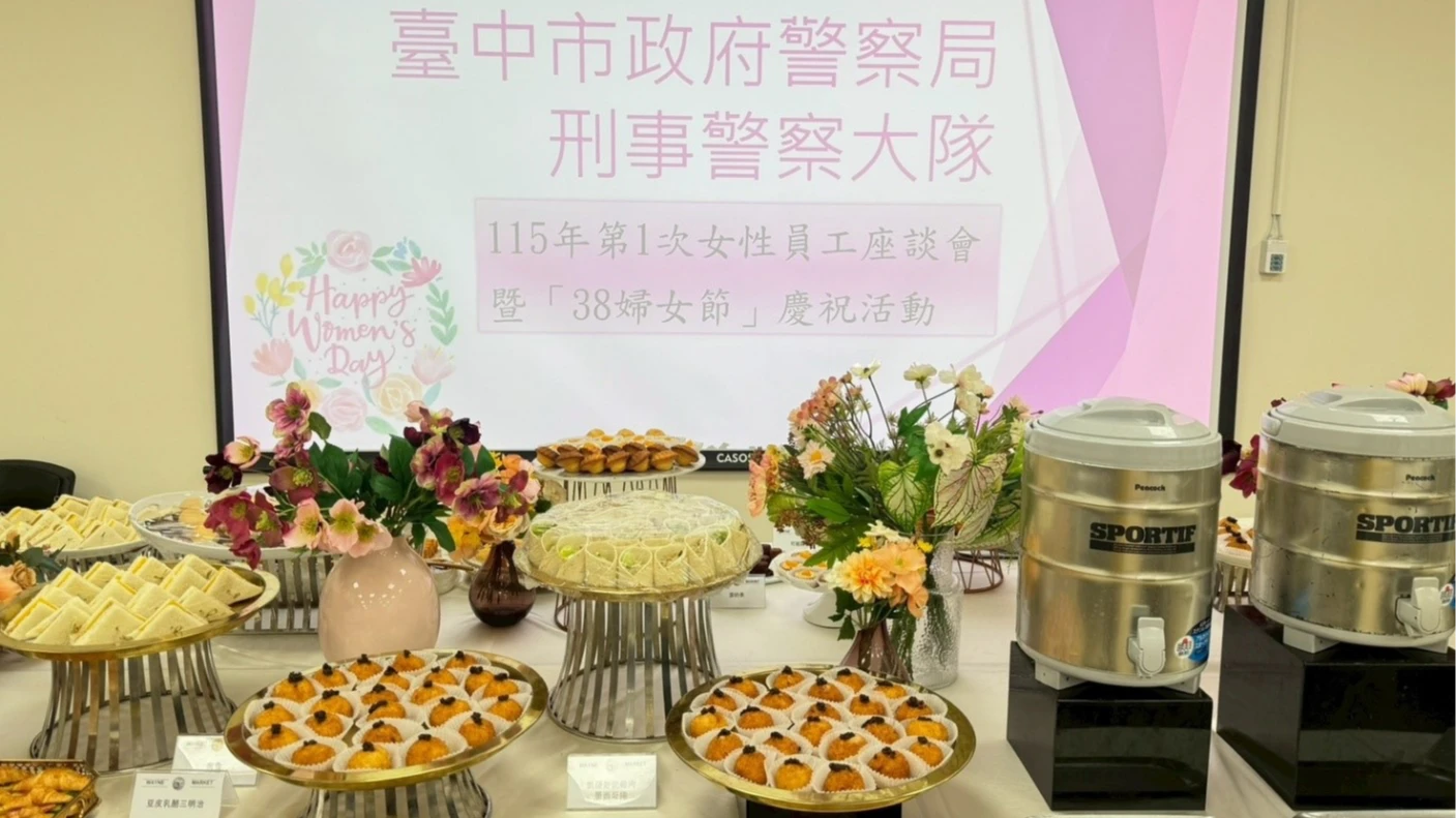 台中市刑大在婦女節前夕,特別安排輕鬆座談交流時間,讓平時忙於刑案偵辦與行政工作的女警,在繁忙公務之餘能稍作歇息、彼此分享工作與生活經驗。現場提供多樣精緻茶點與下午茶自助吧,並準備貼心蛋捲禮盒致贈女性同仁,藉此傳達機關對女性同仁的感謝與重視,也讓大家在溫馨氛圍中度過一段愉快時光。
