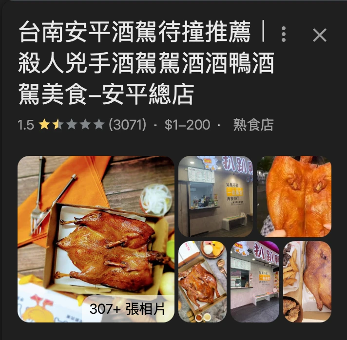 據悉,鄭男為安平知名鹹酥鴨店扒趴鴨老闆,案發後google地圖湧入大量一星負評,網友甚至將店名惡搞成「台南安平酒駕待撞推薦|殺人兇手酒駕駕酒酒鴨酒駕美食-安平總店」,氣憤留言「人命鹹酥鴨」、「臭鴨酒駕0分」、「吃鴨子會被撞死」、「老闆酒駕撞死過人小心被做成肉夾饃」。