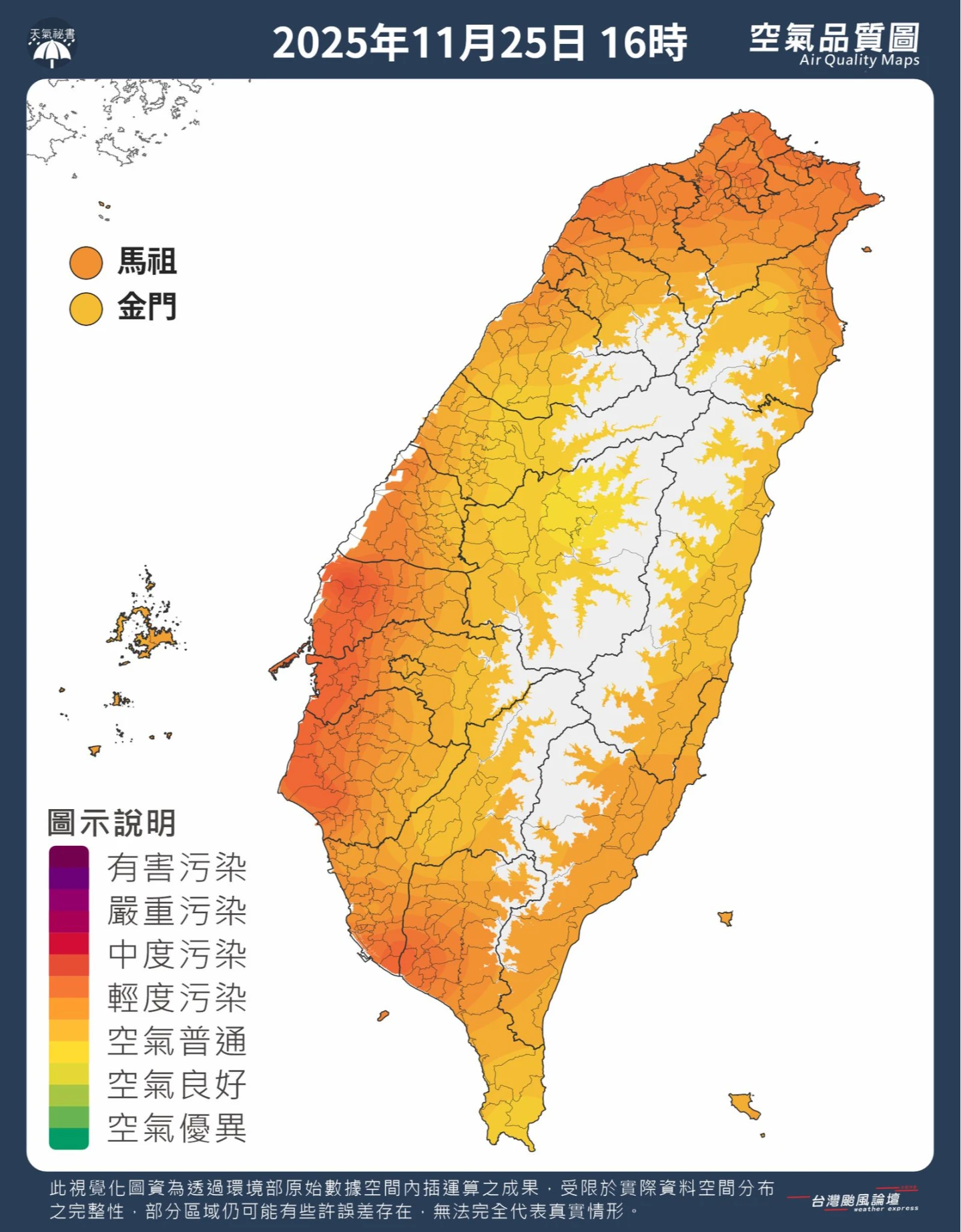 今天竹苗、宜蘭、花東空品區及澎湖為「普通」等級,竹苗可能達橘色提醒等級;北部、中部、雲嘉南、高屏空品區及馬祖、金門為「橘色提醒」等級。