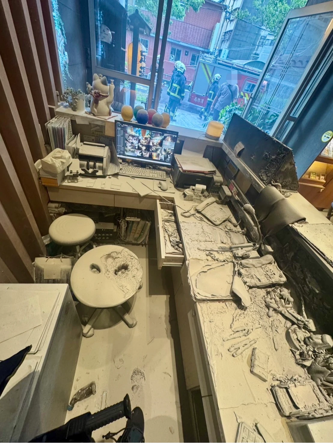 養生店內其他員工見狀,趕緊拿滅火器撲滅火勢,同步通報警、消到場協處,所幸現場未波及其他店家,沒人受傷。