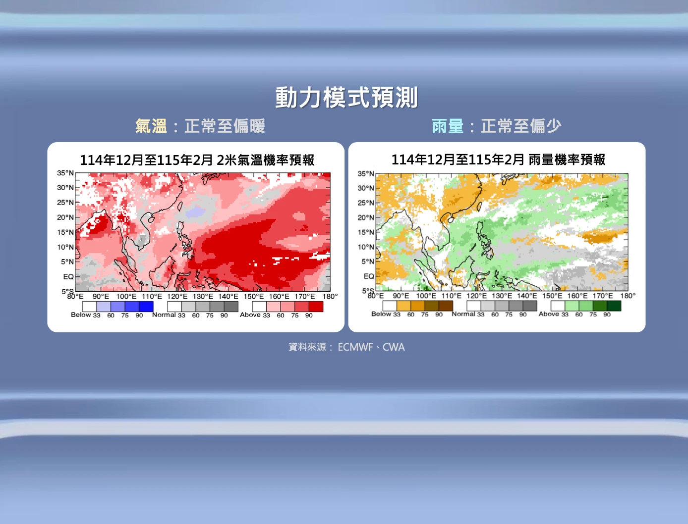 逐月來看,羅雅尹說,12月氣溫正常機率最高,而1月、2月偏暖機會高;降雨方面,12月到2月都是正常至偏少的機會最高。