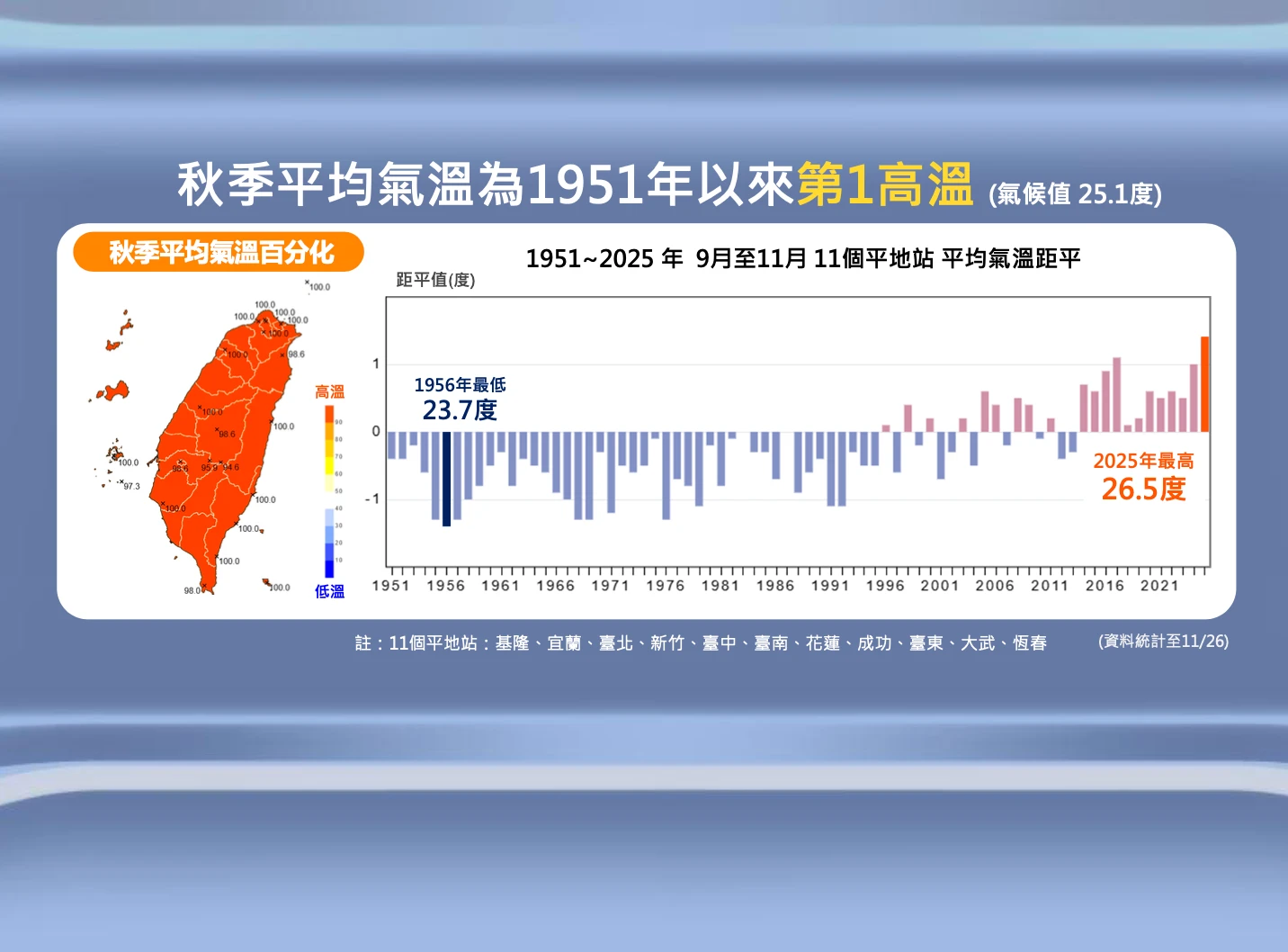 氣溫部分,羅雅尹表示,秋季平均氣溫26.5℃,是1951年來最暖的秋季。