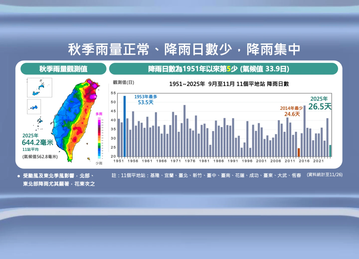 羅雅尹分析,秋季整體降雨雨量正常,但降雨日數少,平均僅降雨26.5天,是1951年來第5少的紀錄,顯示降雨集中少數天數,沒有下雨時,就面臨高溫問題。