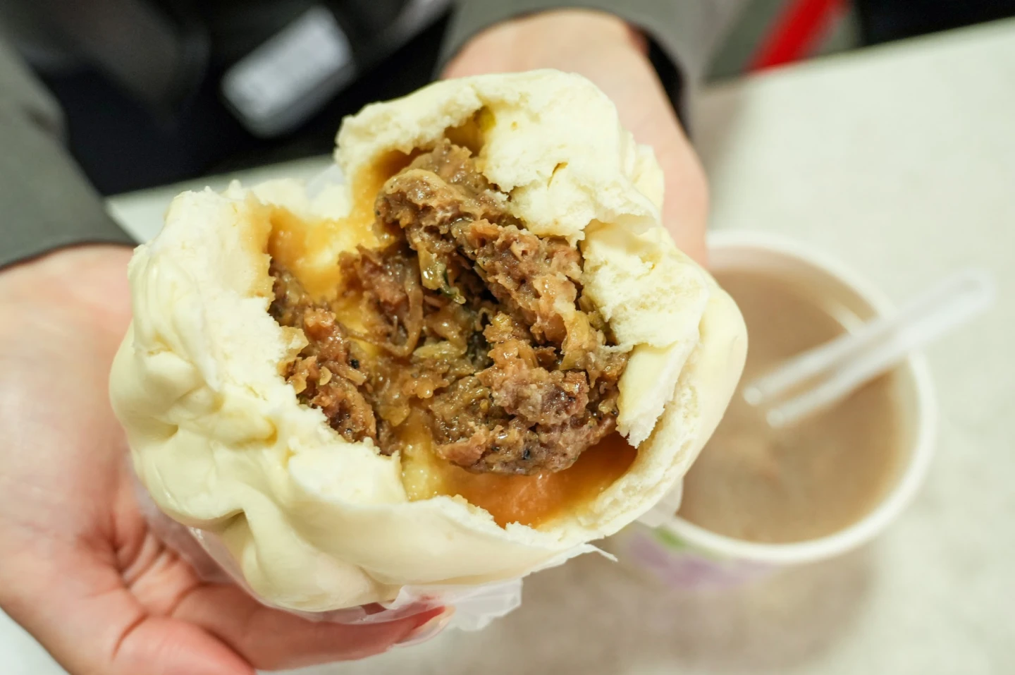 第二站來到位於民生西路、迪化街一段的「妙口四神湯・肉包」,自1973年開業,飄香超過50年,用餐時間總是座無虛席。肉包外皮柔軟細緻,一咬下熱氣竄出,麵香立刻撲鼻;內餡是豬肉加入洋蔥調味,鮮甜多汁卻不油膩,尾韻還帶點黑胡椒香,沾點店家的甜醬更添添風味。