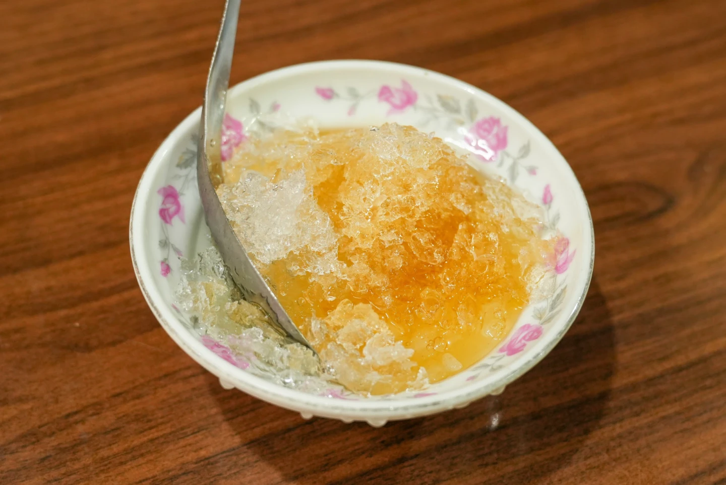 第一站來到在地40年老字號「顏記杏仁露」,位於霞海城隍廟旁永樂市場一樓,是在地知名冰飲店,招牌「杏仁露」會先鋪上碎冰,再淋上古早味糖水,一大塊晶瑩剔透的杏仁凍躺在碗裡,看了就讓人暑氣全消,口感像果凍般Q彈滑嫩,就算平常害怕杏仁味的人也能安心嘗試,香氣不會強烈衝進嘴裡,而是淡淡地慢慢散開,清爽又解膩,是夏天消暑的經典選擇。